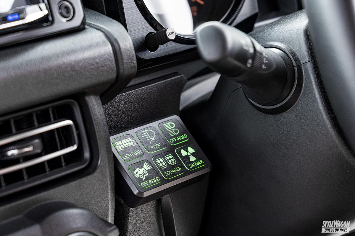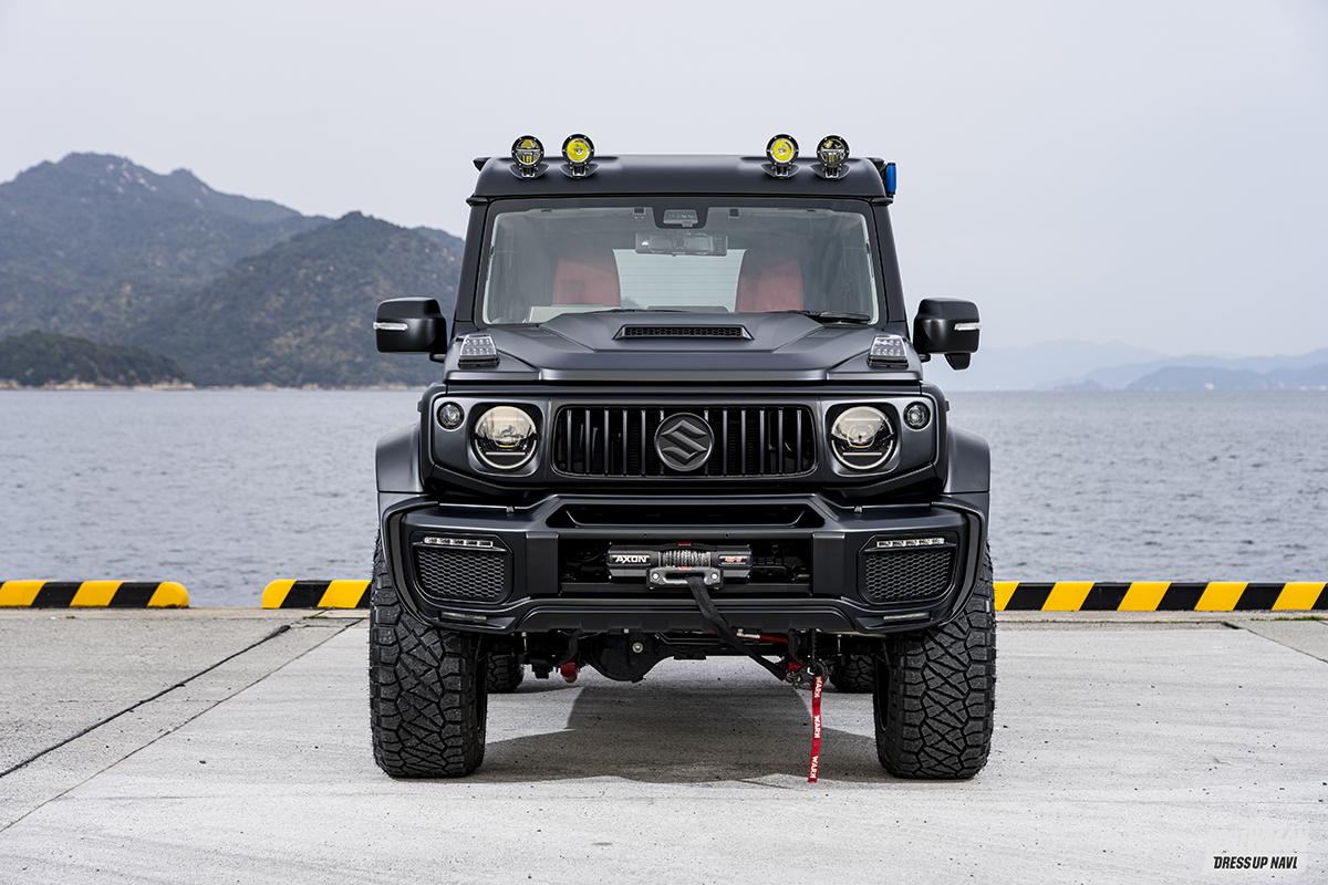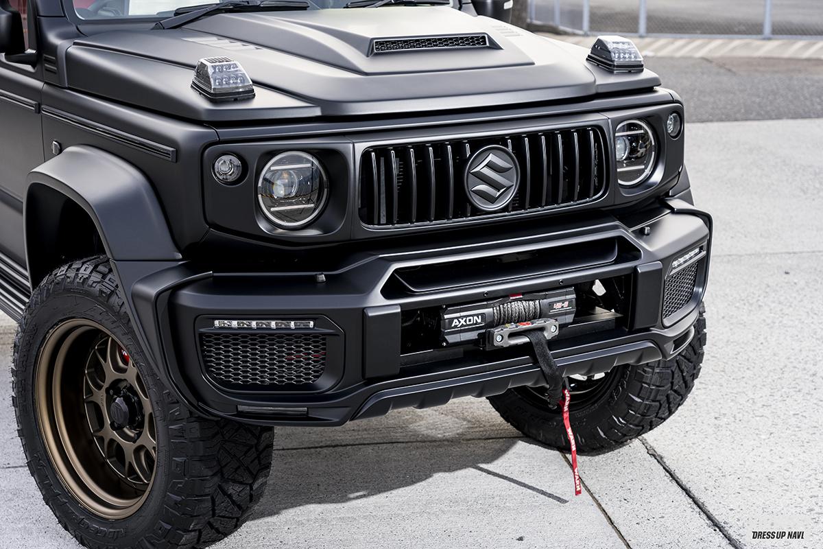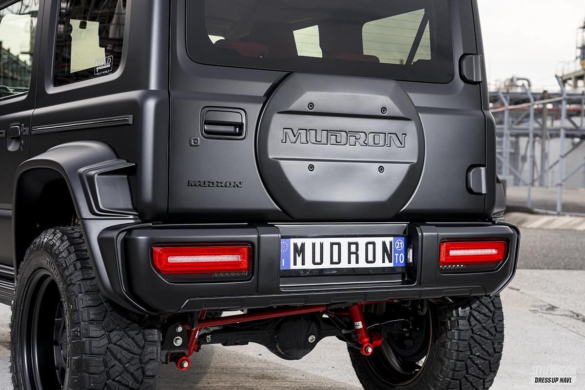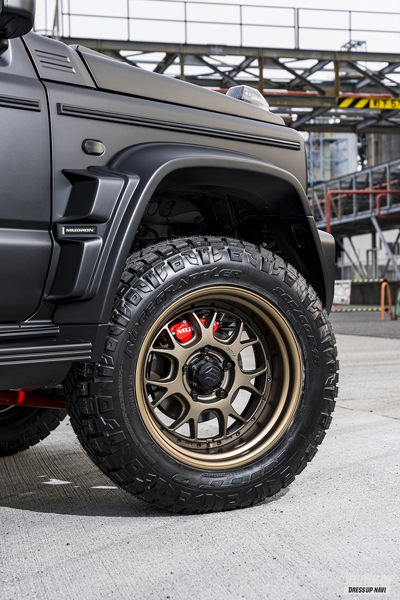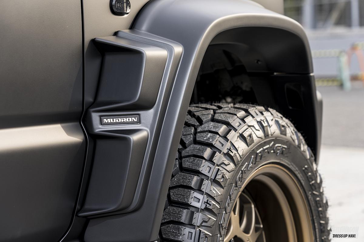 速やかにそして鮮やかに、ジムニーのエアロ市場で広がりを見せる「MUDRON」。2022年に登場した振興勢力だが、即幅広いバリエーション展開をした結果、認知されるブランドに成長。オフ会などで見る機会も増えてきた。その根底にあるAIMGAINで長年培ってきた「ワイド&ロー、突き詰めた造形の美しさ」を表現しているのが「GT-Xシリーズ」。スタイリングのベースとなるのは現行のメルセデスGクラス。同様の仕様はすでに幾多もあるが、細部までメリハリを効かせた精巧な作り込みはMUDRONの真骨頂。今回レクサスのマッドブラックに全塗装されたことで、ボディ各部のラインが際立ち、遠目から見てもインパクトは抜群。そのセンスの良さにも脱帽だ。