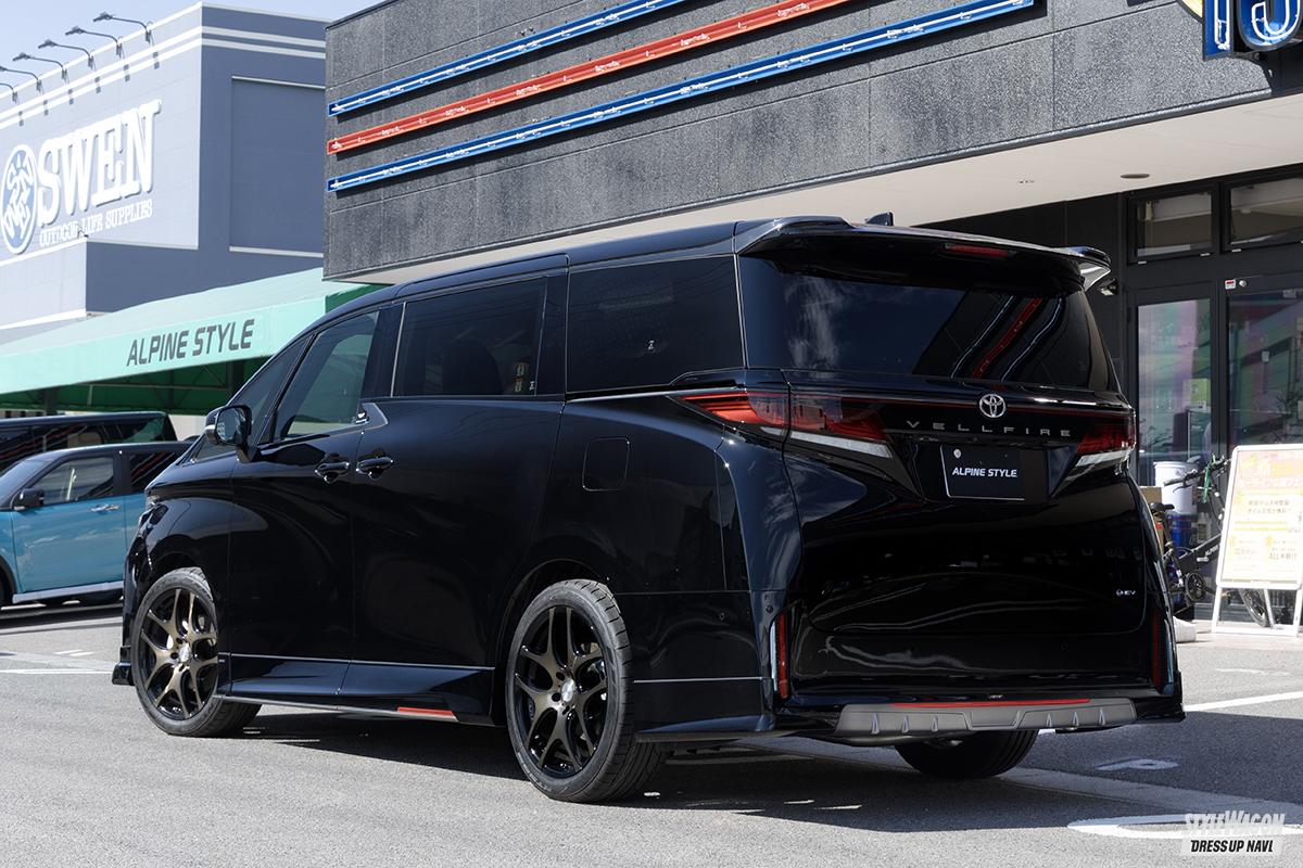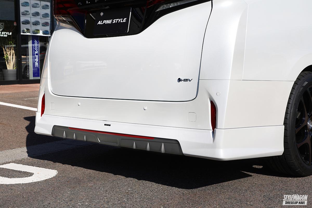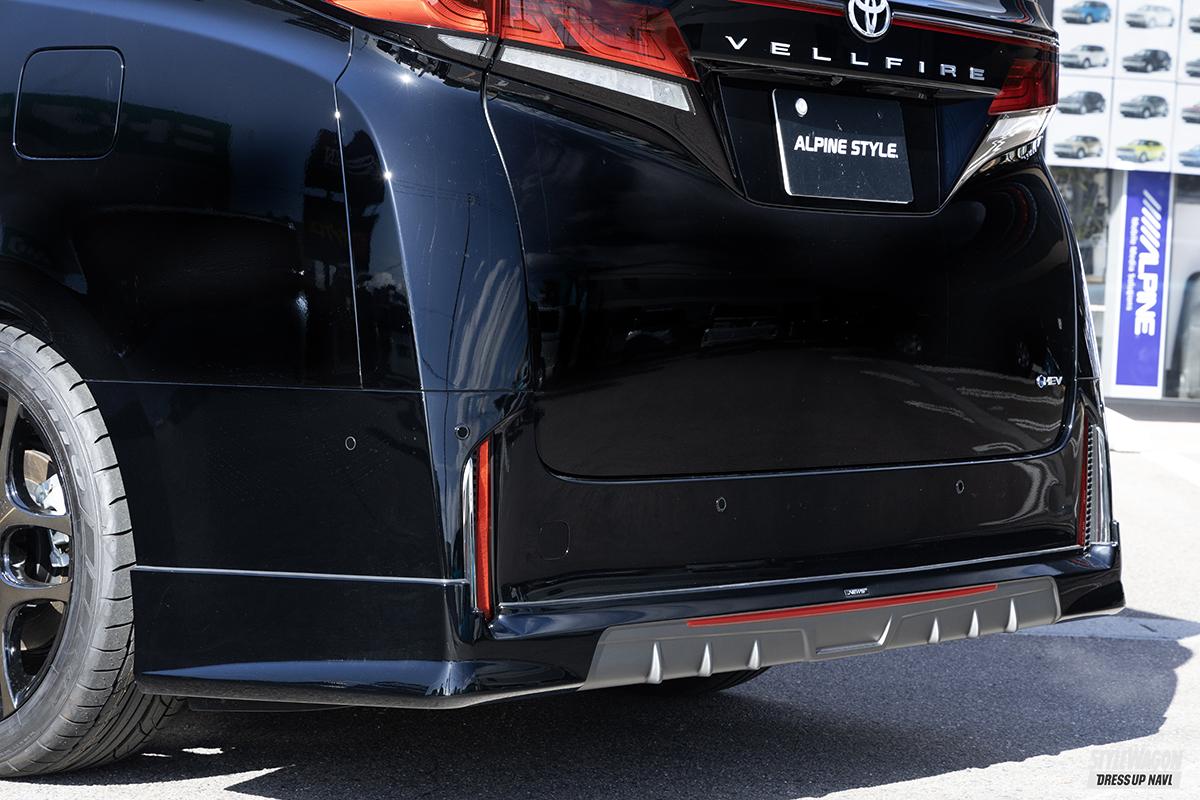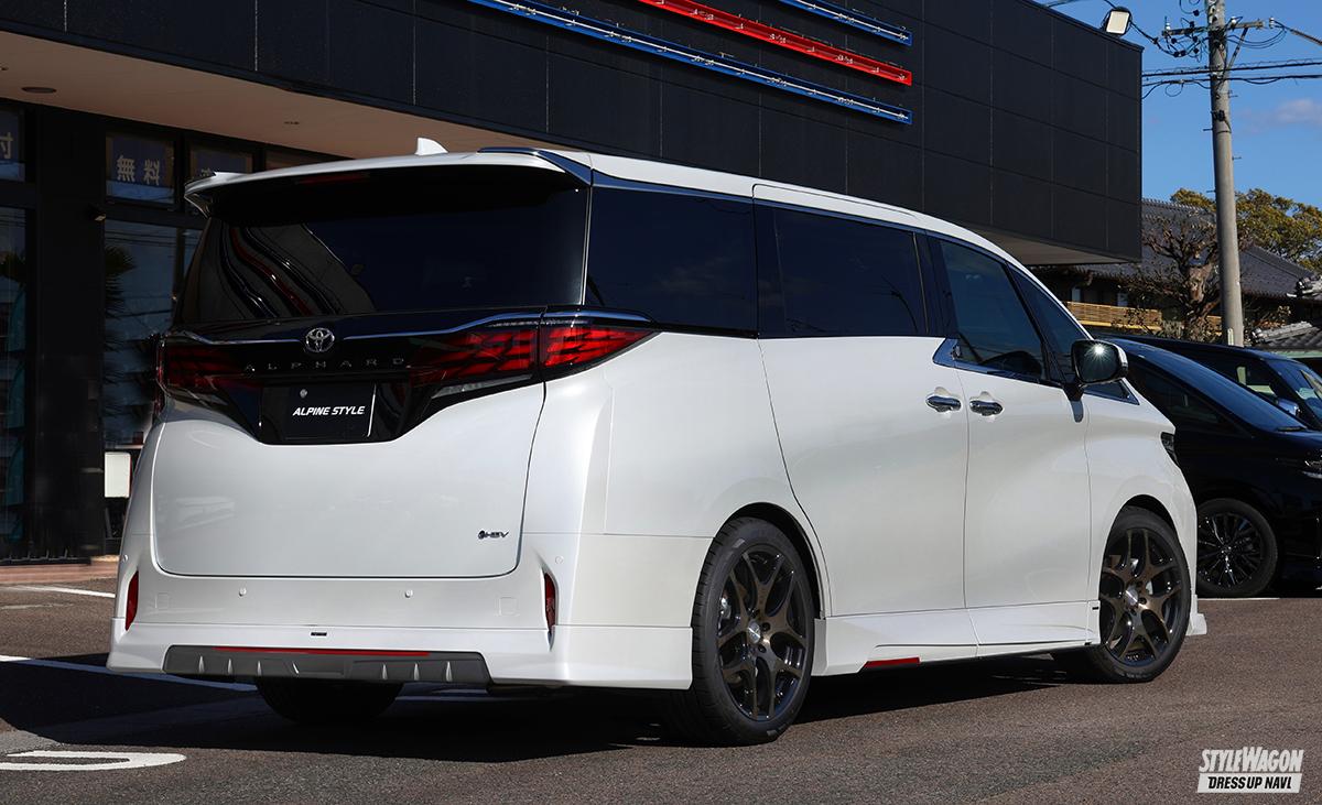 アルパインスタイルの40系アルファード&ヴェルファイアは、ニューズデザイン製ボディキットとヴァルケンのホイールでエクステリアをまとめ、40系アルヴェル専用デジタルインナーミラーやリフトアップスピーカーなどでインテリアおよびサウンドメイクを展開。この状態での新車コンプリートとして購入可能となっている。ボディキットは前後ハーフタイプのスポイラーとサイドステップの3点構成。フロントハーフスポイラーは、純正バンパーから段を付けながら延長される立体デザインが特徴。左右にはスリット状ダクトを配置し、最下部には別体式リップを装着しているかのようなデザインを採用。リップセンターにはアクリル調のレッドラインが刺し色で入れられている。サイドステップは40系アルヴェルのサイドウインドウ下部ラインに対応する切り返しのラインを導入。動きを感じさせる立体的なサイドステップとなっている。リアハーフスポイラーは、左右に3本ずつのフィンを備えたディフューザー形状とし、シンプルながらスポーティさをプラスしたリアビューを演出。凝ったデザインながら40系アルヴェルのスタイルやイメージを損なうことなくスマートなスポーティスタイルを完成させている。