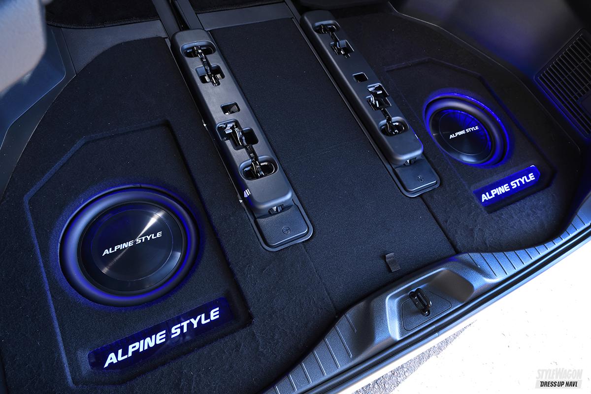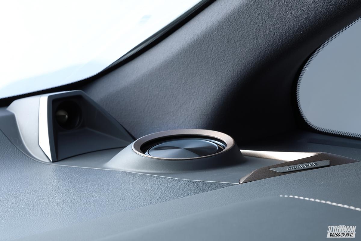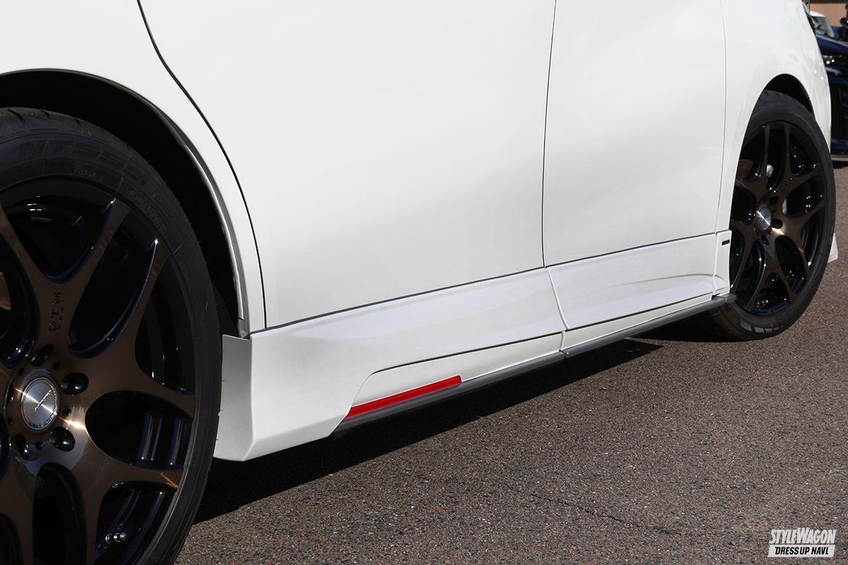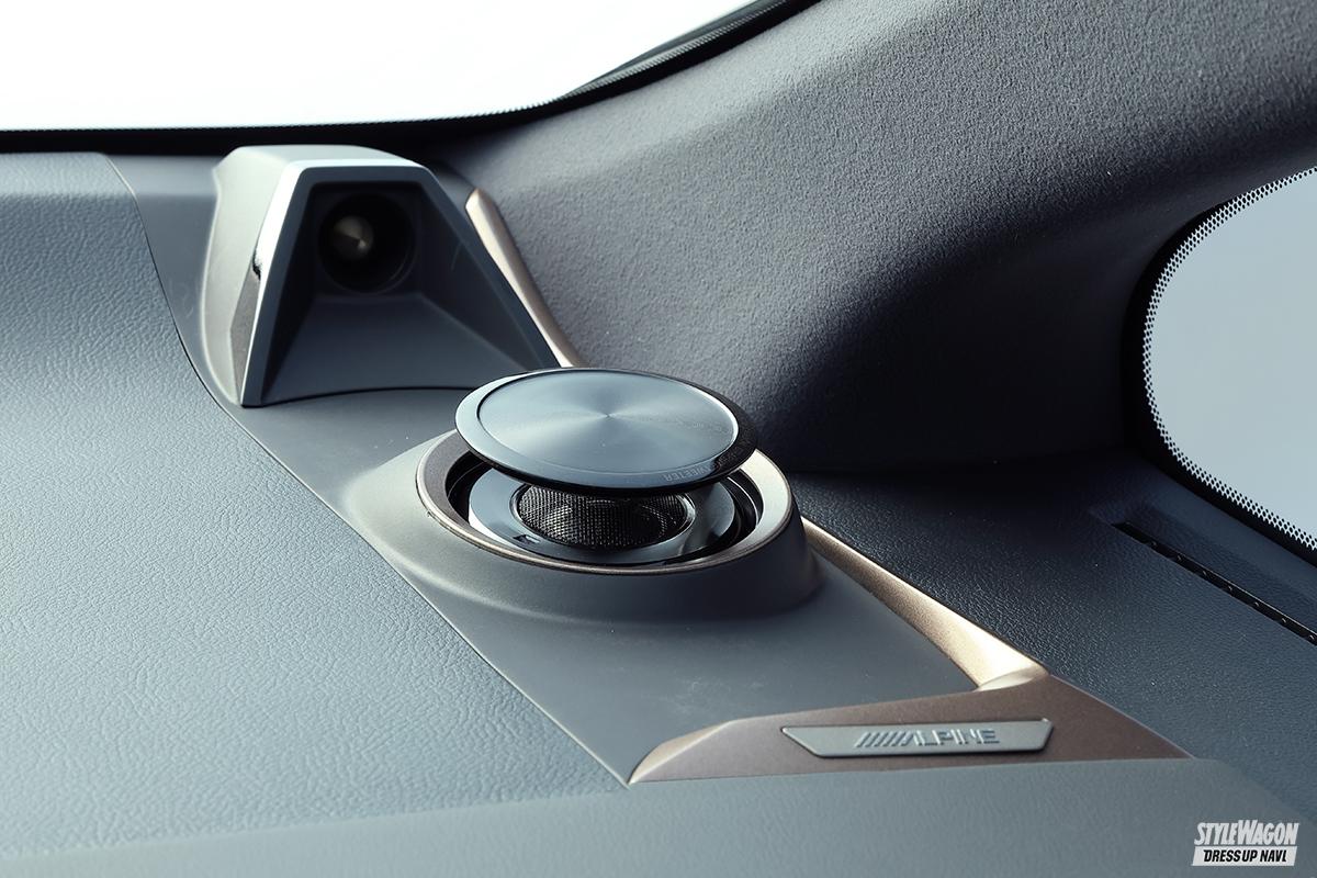 アルパインスタイルの40系アルファード&ヴェルファイアは、ニューズデザイン製ボディキットとヴァルケンのホイールでエクステリアをまとめ、40系アルヴェル専用デジタルインナーミラーやリフトアップスピーカーなどでインテリアおよびサウンドメイクを展開。この状態での新車コンプリートとして購入可能となっている。ボディキットは前後ハーフタイプのスポイラーとサイドステップの3点構成。フロントハーフスポイラーは、純正バンパーから段を付けながら延長される立体デザインが特徴。左右にはスリット状ダクトを配置し、最下部には別体式リップを装着しているかのようなデザインを採用。リップセンターにはアクリル調のレッドラインが刺し色で入れられている。サイドステップは40系アルヴェルのサイドウインドウ下部ラインに対応する切り返しのラインを導入。動きを感じさせる立体的なサイドステップとなっている。リアハーフスポイラーは、左右に3本ずつのフィンを備えたディフューザー形状とし、シンプルながらスポーティさをプラスしたリアビューを演出。凝ったデザインながら40系アルヴェルのスタイルやイメージを損なうことなくスマートなスポーティスタイルを完成させている。