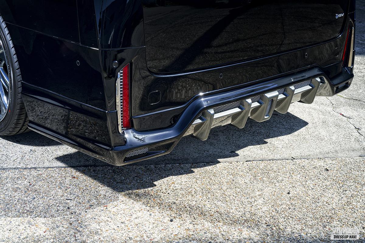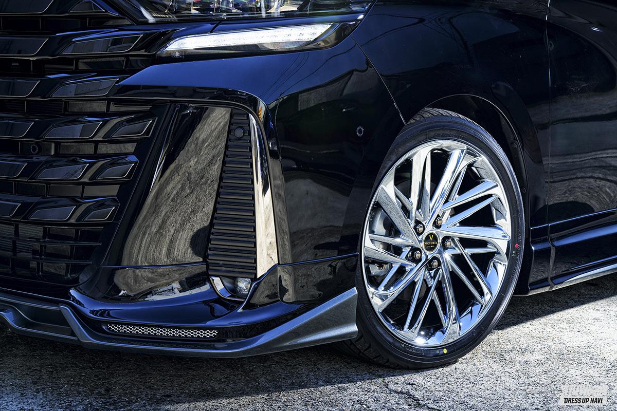フロントはヴェルファイアらしい躍動感を与えるハーフスポイラー形状。立体的でワイドなAラインの下に、さらにAラインを重ねたダブルリップ風スタイリングで、両端には精悍なダクトも刻まれる。両側面がカナード風に立ち上がっていることもあり、スポーツ度が高まるデザインだ。