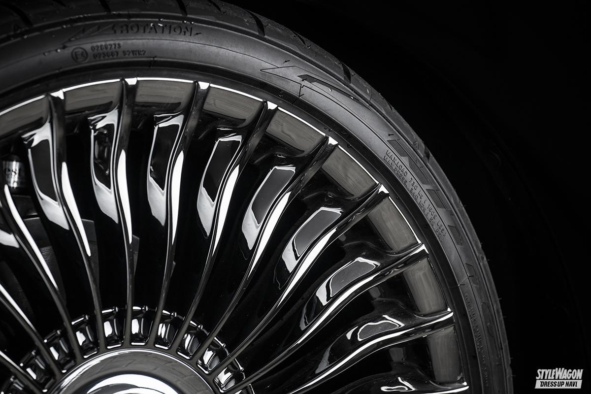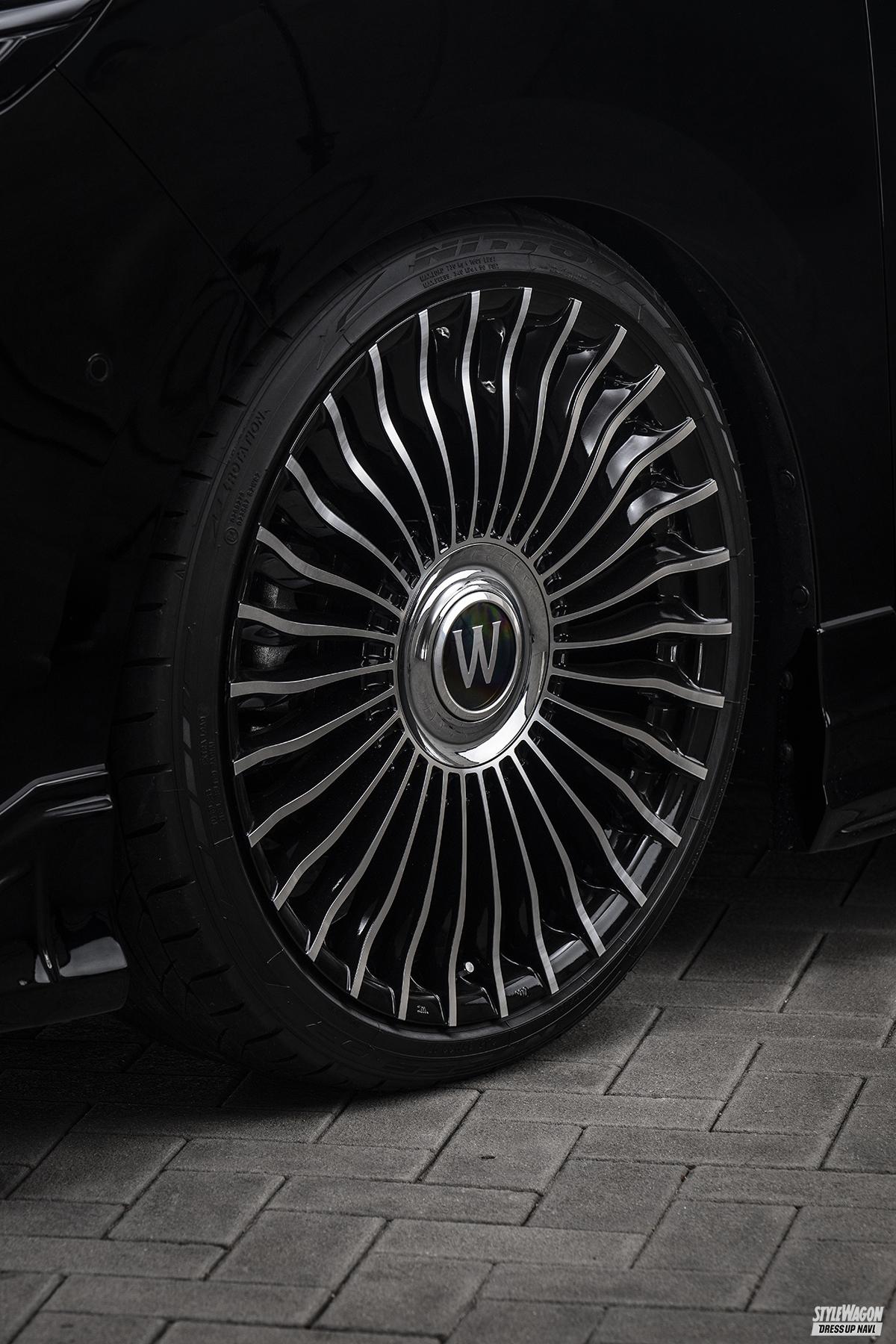 世界に向けた和製チューナーとして名を馳せるヴァルド。これまで多くのプレミアムカーを手掛けてきたブランドであり、高級車へのアプローチに長けたブランドだ。そんなヴァルドが2024年モデルとして、40系アルヴェルをターゲットに据えてリリースしたのが、このレノヴァティオ。波打つようなフェイスは妖艶で美しく。細身のスポークは天面からひねりを入れてサイドに広がり、優雅な動きを表現する。センターにも注目。ロゴが常に地面と平行を保つフローティングセンターカバーは、ロールスロイスを彷彿とさせる目を惹く仕掛けだ。サイズは40系アルヴェルを狙った22×9・0J+40のみと潔し。この美しいホイールは40系アルヴェルでしか履けない、特別なモデルなのだ。