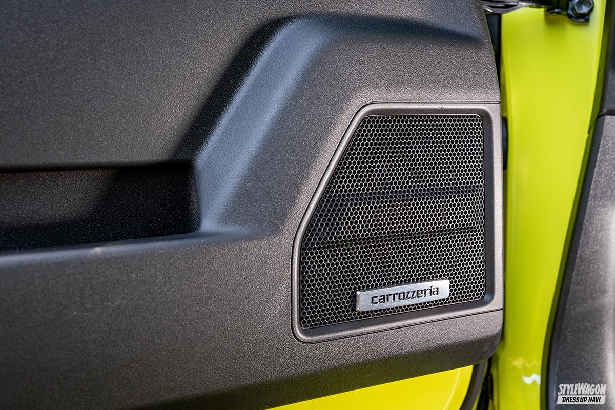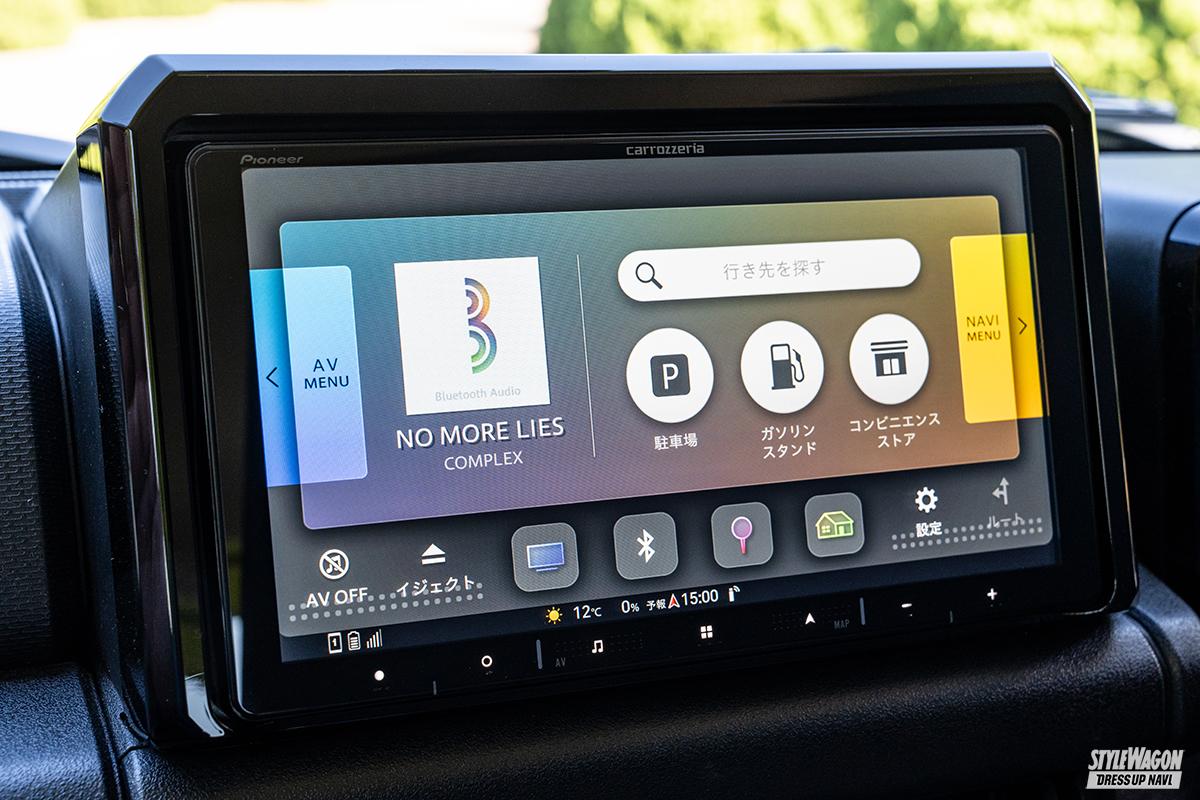 標準仕様がオーディオレスとなるジムニー&ジムニーシエラ。ディスプレイオーディオやパネル一体型ナビなどではなく、センターパネルには、スタンダードな2DINスペースが空いている。ある意味ナビ&オーディオの自由度が高い。そこでお薦めしたいのが、パイオニア・カロッツェリアの楽ナビだ。画面サイズは9インチと超大型。ジムニー&シエラ用に作られた取付キットを使えば、まるで純正かのように自然にインストールできる。そもそも楽ナビは、カロッツェリアの定番ナビとして、25年以上の歴史を持つ人気シリーズで「ドライブをもっと楽に、もっと楽しく」を追求してきたモデル。注目すべきはオンライン対応。ネットワークスティックと呼ぶ通信機器同梱モデルであれば、外部サーバーのデータを活用したルート検索や渋滞情報、自動地図更新などオンライン機能が使えるようになる。さらに「docomo in CAR Connect」を契約すれば、車内を容量無制限のWi-Fiスポットにでき、最大で同時に5台の通信機器が接続できる。スマホのミラーリング再生や後席でお子さんが楽しむタブレット、ゲーム機なども、通信量を気にすることなく楽しめるのだ。
