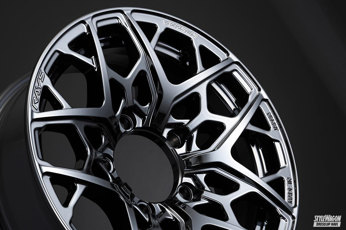 ベースとなったのは新しいスポーツメッシュとして高い評価を受けているVV25M。その持ち味である優れた応力分散性はそのままに、ジムニー&シエラへ向けたアップデートが施されたのがVV25Mだ。2種類のY字スポークが高低差を持って、まるで立体交差するように複雑に絡み合うデザインは独特。ダブルフェイス仕様となるため表情の奥行き感も強く、独特なメッシュスタイルだから周囲へのアピール度もバツグン。トップスポークの先端はリムオーバー形状となるため、伸びやかさや大口径感を獲得できるのもポイントだ。