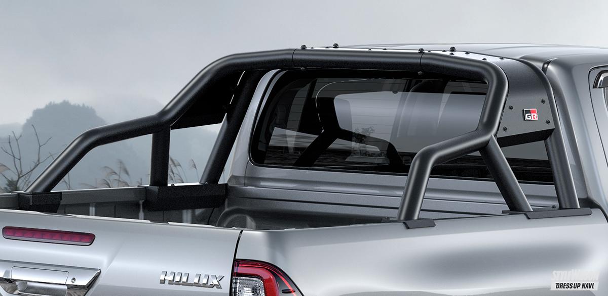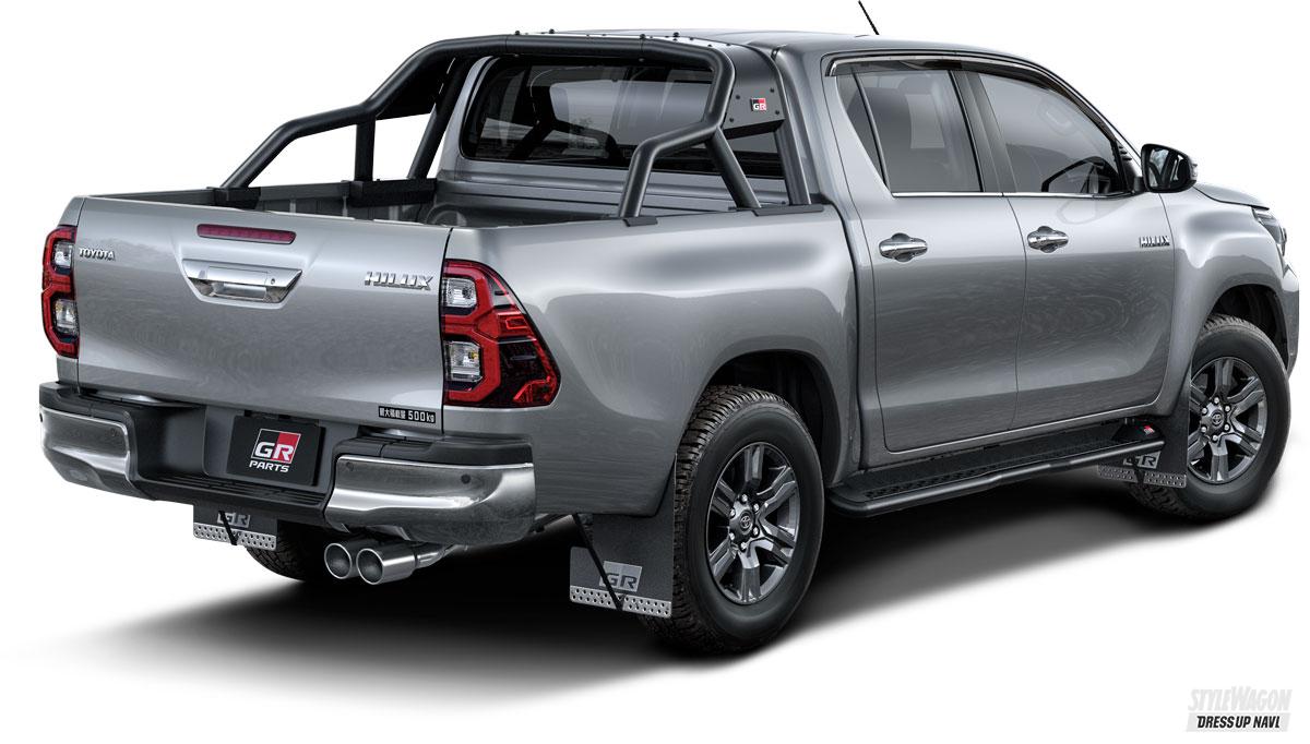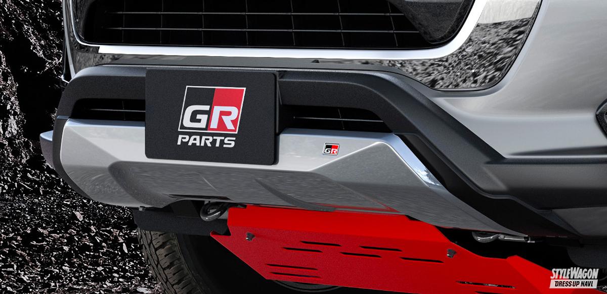 トヨタ車に特化したカスタムパーツやチューニングパーツを手掛けるTRDが、純正オプションとして展開しているGR PARTS(GRパーツ)は、純正グレード「GRスポーツ」とはまったくの別モノだ。ボディ底を守るフロントアンダーカバーや、荷台用の骨太感のあるスポーツバー、泥除けだけでなくドレスアップ性も高いマッドフラップ、さらに走行安定性を高める機能的なサイドバイザーといった、オフスタイルに磨きをかけるワイルド系パーツが数多く揃っている。