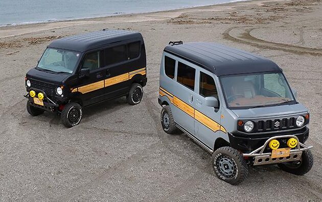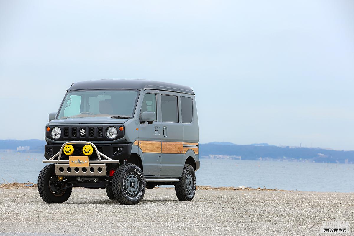 というわけで、ここで顔面変更を施した2台のエブリイがある。双方ともにTスタイルがコンプリート展開しているものだが、グレーがジムニー顔のジムリィキット、ブラックがダムドのリトルDキットを投入した2台だ。