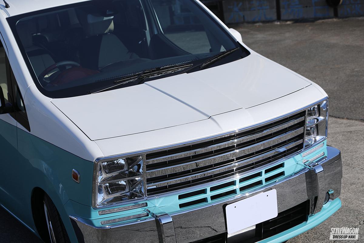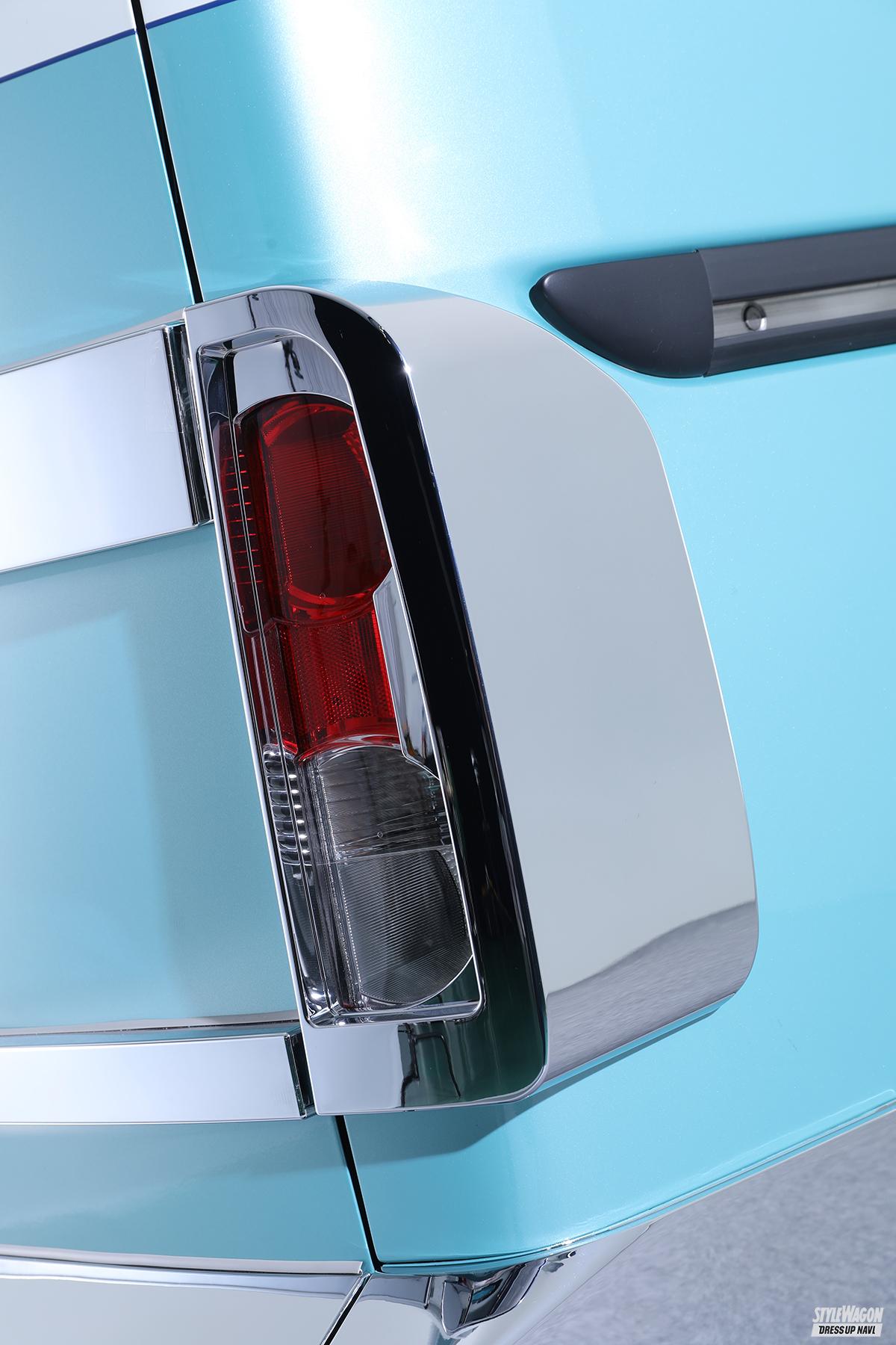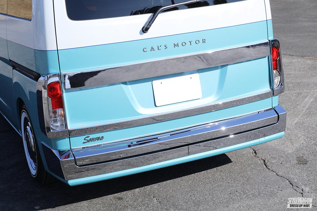 キャルズモーターでは、同じジャンルのモデルは作らないという前提のもと、1BOXのカリカ、ミドルSUVのハバナに続く第3弾モデルを検討していた。その中で行き着いたのが、ファミリーユーザーをターゲットに据えた3列シートのミニバンだ。ファミリーがファミリーらしく使えるという意味で、やはり日本国内においては3列ミニバンは欠かせない存在。実際、カリカ登場時も、「3列シート仕様はないのか」という声が多く聞かれたという。それからのベース車選定、デザイン、カスタム項目検討などを経て完成したのが、このソノバだ。ベース車は日産・NV200だが、その面影はほぼなく、直感的に思い出すのはシボレー・アストロやシェビーバン。逆スラント形状のフェイス、前後メッキバンパー、それに合わせたメッキホイール&ホワイトリボンタイヤなど、「あぁ、そうだ、思えばこんな雰囲気だったな」と思わず懐かしがってしまうほど、〝旧き良き〟の再現率は高い。
