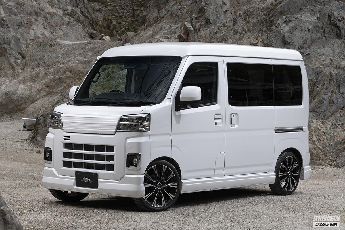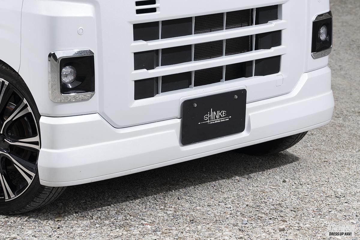 ベッドキットでおなじみSHINKE(シンケ)から、現行S700ハイゼットカーゴ/アトレーの内外装をトータルにカスタムできる魅力的なアイテムが多数登場。サゲ用のエアロは前後ハーフスポイラーとサイドステップ、フロントグリルの4点構成。シンプルなデザインのエアロは、ボディ下部にボリュームを与えるデザインとなっていて、ノーマルよりも安定感がアップしスポーティなスタイルに変身。ノーマル車高からローダウン車までフィットするエアロとなっている。