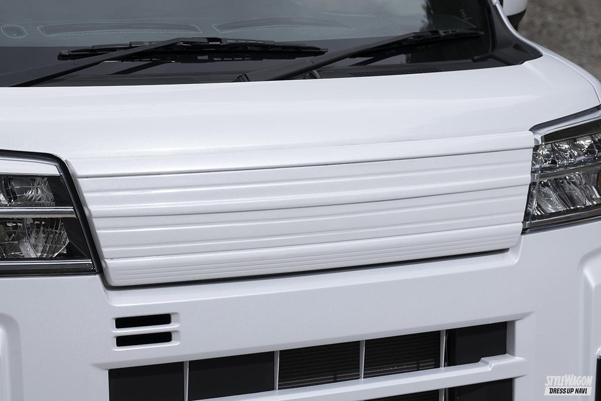 ハイゼットカーゴは前後ハーフタイプを採用したシンプルなデザインが特徴。フロント、サイド、リアのエアロ3点にフロントグリルも用意。エアロはシンプルだが下部にボリュームを与えているので、ノーマルよりも安定感が増し、スタイリッシュ&スポーティなフォルムに変身できる。アトレーの場合は純正エアロやグリルを取り外せば装着可能だ。