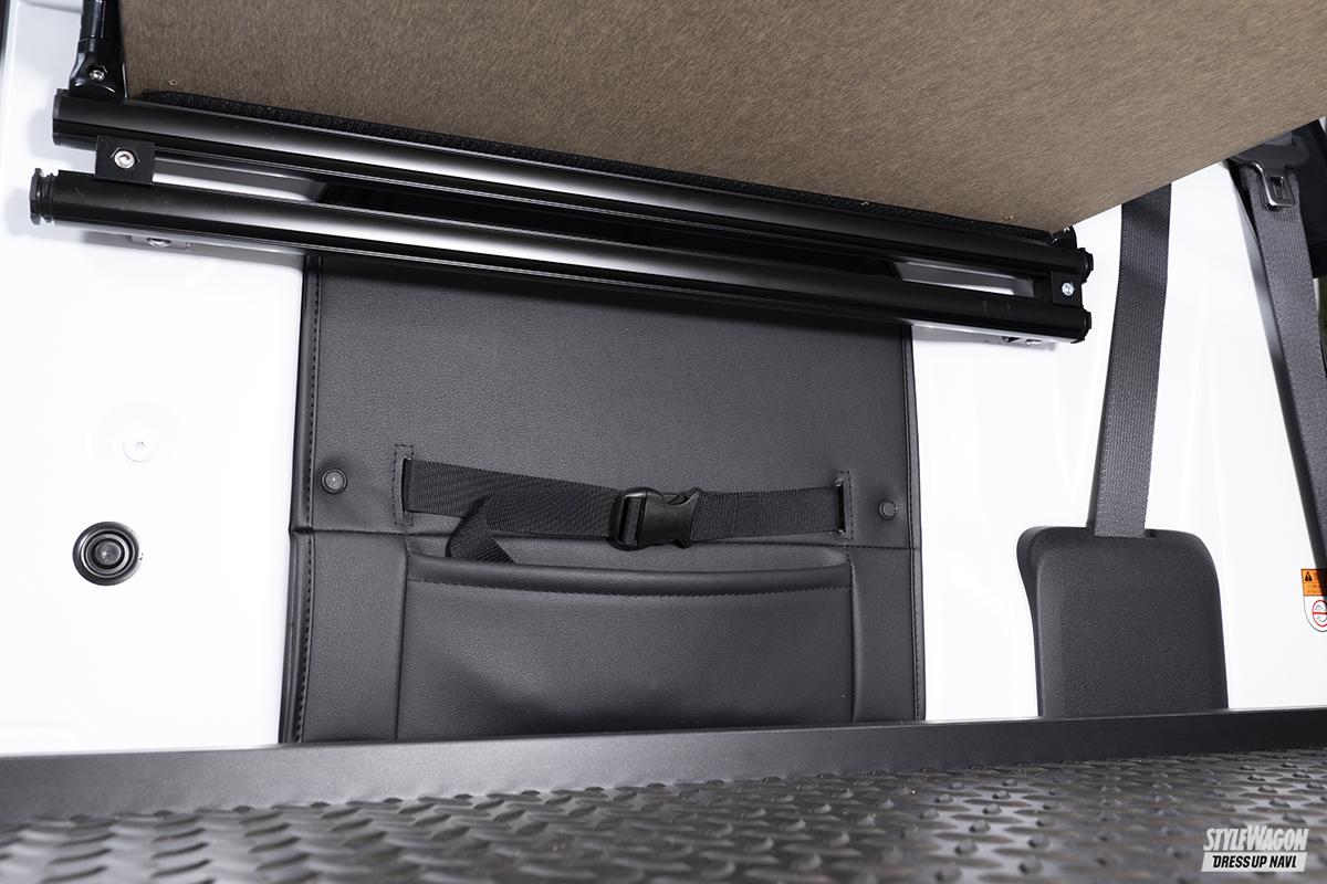 内装系では、車中泊に便利な高さ調整式ベッドキットやカーテン、折り畳み式のフリップダウンテーブル、キャンプにも仕事にも活躍するスライドキャリア(ハイゼットカーゴ専用)などをラインアップ。スライドキャリアは荷室フロアに装着するスライド式のフロアで、たくさん荷物を積んだ時に、通常のフロアだと奥に積んだ荷物の出し入れが面倒くさいのだが、フロアがスライドするので荷物の出し入れがラクラク。スライドフロアと同時装着可能な上部のラック(別売)を装着すれば、荷室を上下に分けて使えるので、効率よく荷物の積載が可能になる。どちらも単品またはセット購入が可能だ。
