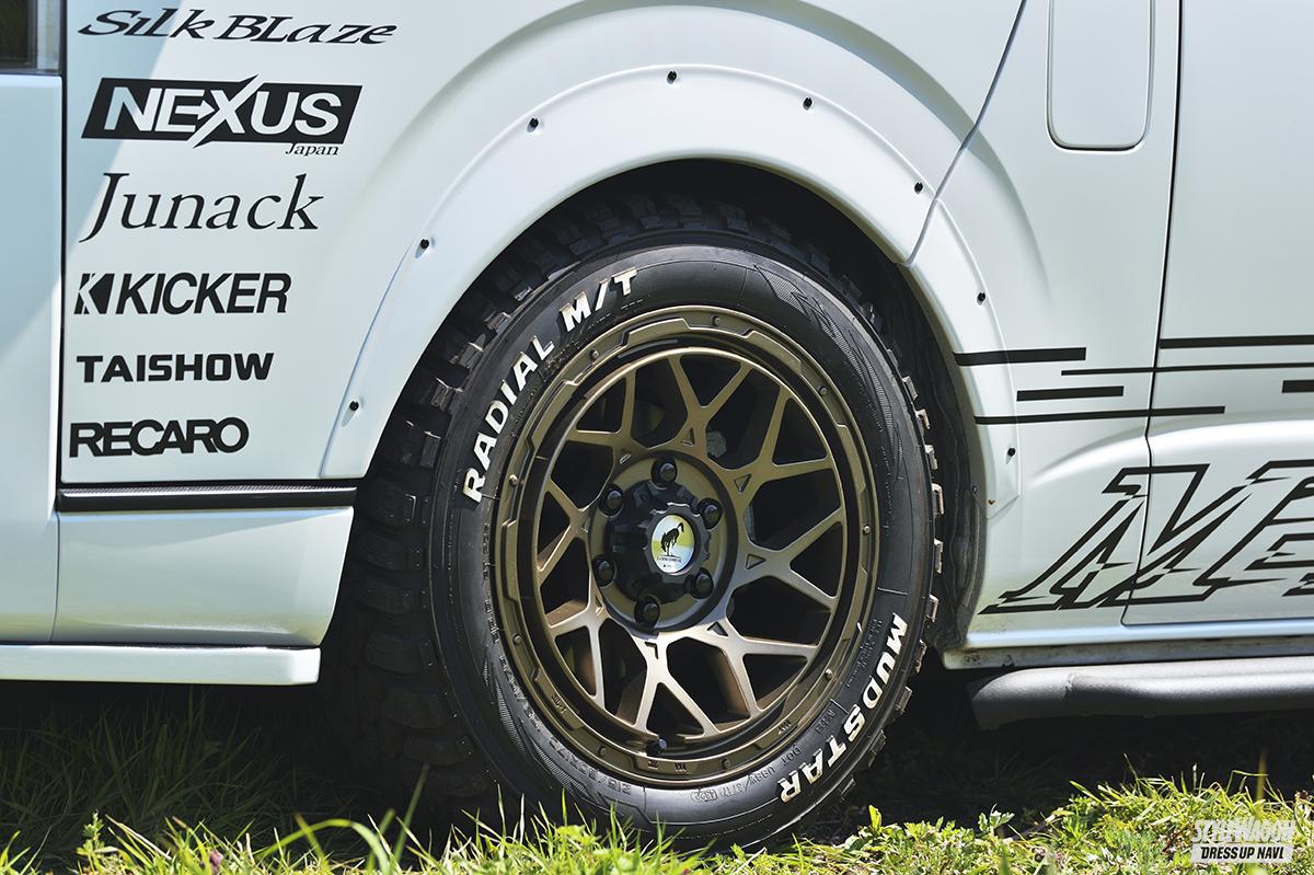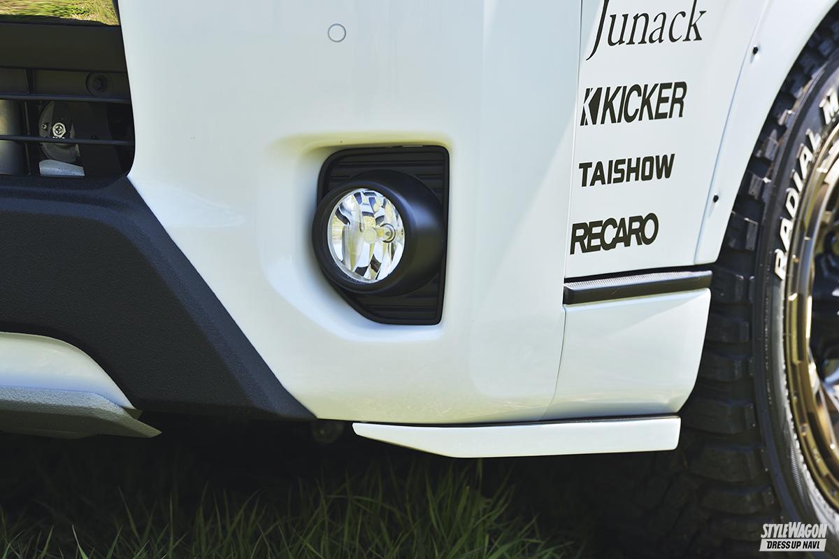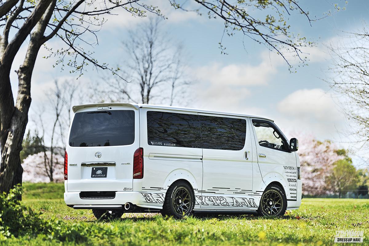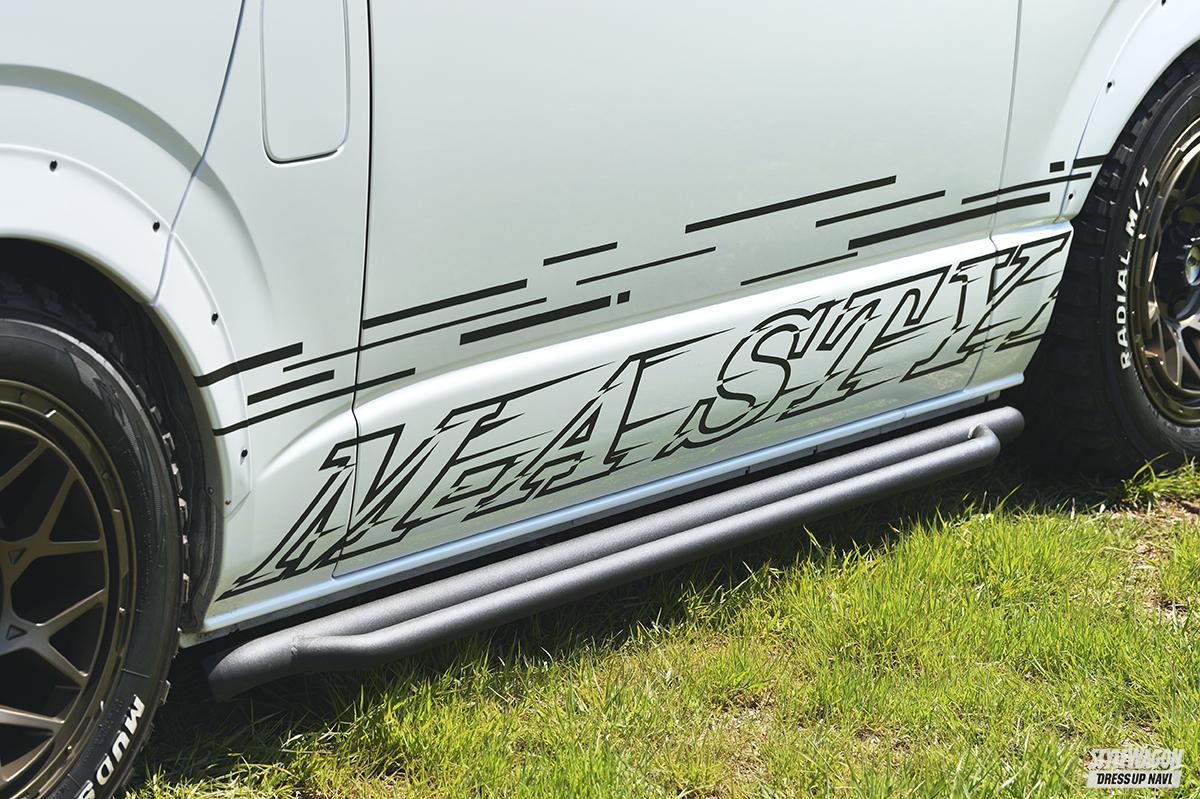 ローフォルムの演出に効果的なサイドスポイラーも相まって、しっかりとオフ×車高短を両立。M-Aスタイルならではの提案、気になっている人も多いんじゃない?