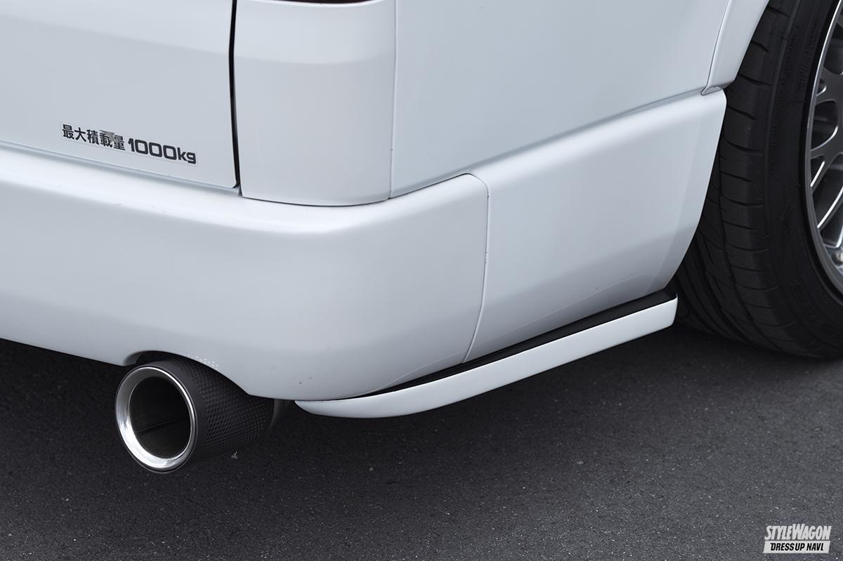 既発の標準車とフロントの仕様が変わるワイドボディ向けが登場。F/S/Rすべてがフラップタイプで、純正シルエットを崩すことなくワイド&ロースタイルを実現。適度の張り出しとボトムへ30㎜の厚さを持たせたサイズ感が、ちょうどイイまさにアヴァンツァーレ流。フラップの名の通り、翼のような造形を各所に持たせることで、さり気なくスポーツテイストも香らせることができる。とくにフロントは3ピース構成で別体感強め。天面をブラックで塗り分け、絶妙な張り出し感を演出した。薄型ながら、ワイド&ローという我が国伝統のスタイルを見事に表現したM‐Aスタイル。#200で稀有なフラップエアロの登場だ。