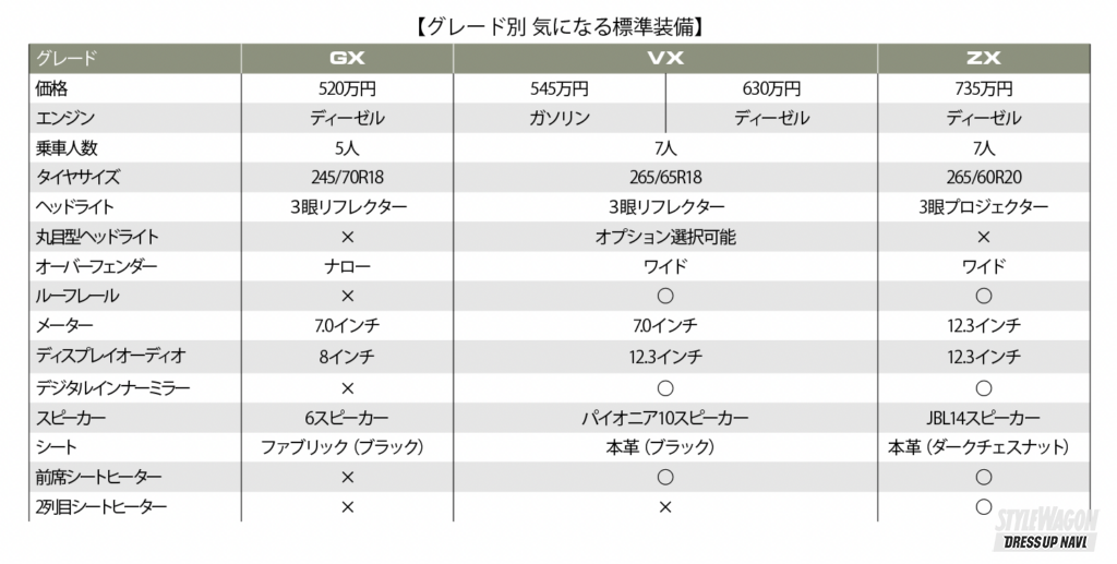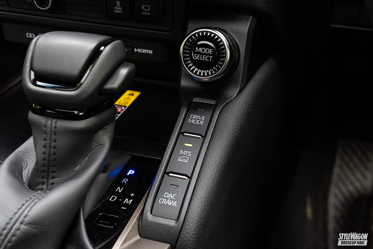 オフロードでの乗り心地の良さや高い接地性、オンロードでのハンドリングなども両立するべく、「AVS(アダプティブ・バリアブル・サスペンション・システム)」を採用した。オフロードで「L4」にすると、タイヤの接地性が高まり、モーグルで2輪が浮いた状態でも安定性を向上。「H4」では、ハンドリングと乗り心地を両立させ、走行モードに応じて減衰力も制御する。また、トヨタ初採用の「SDM(スタビライザー・ウィズ・ディスコネクション・メカニズム)」は、「ZX」に標準で、スイッチ操作でスタビライザーのロック、フリーの切替が可能。オフ/オンロードなど状況に応じて最適な接地性や乗り心地を確保できる。