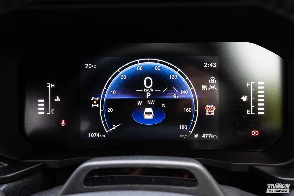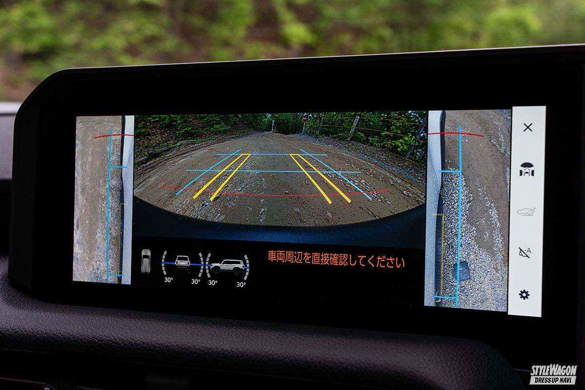 そのほか、「AUTO」、「DIRT」、「SAND」、「MUD」、「DEEP SNOW」、「ROCK」から選べる「マルチテレインセレクト」により状況を問わず高い走破性を発揮できる。また、ランクル300にも用意されている「アンダーフロアビュー」、トヨタ初採用の「バックアンダーフロアビュー」などの透けて見える技術によりドライバーの安心感も高めてくれる。オフロード画面も多彩で、トランスファーレンジやアクセルとブレーキの踏み込み量なども見える化している。