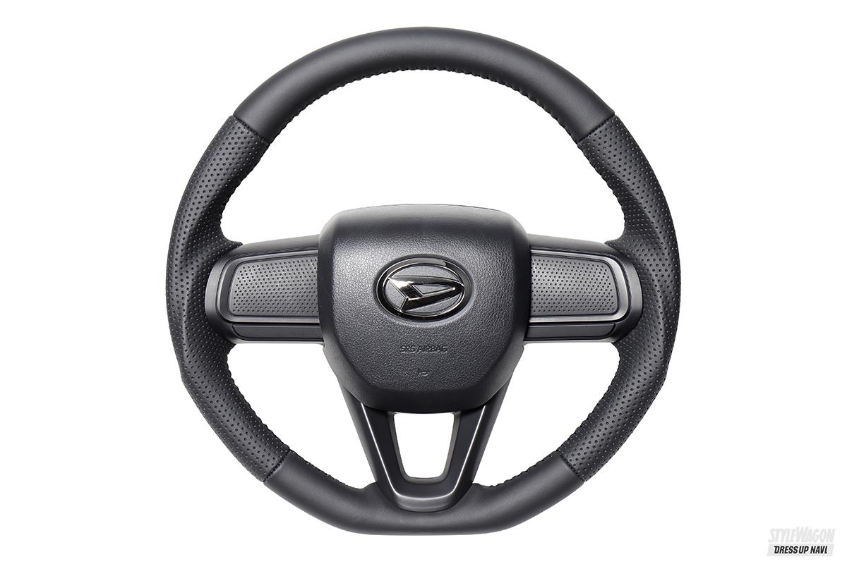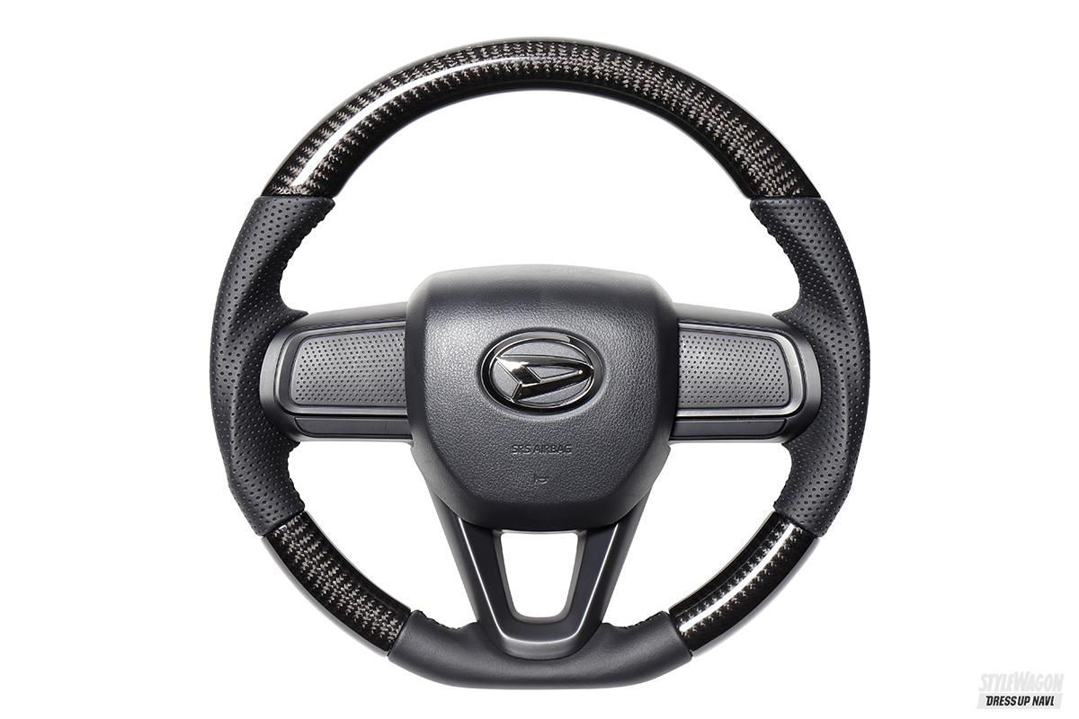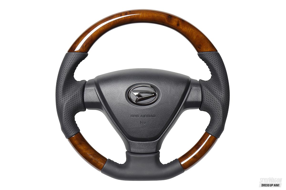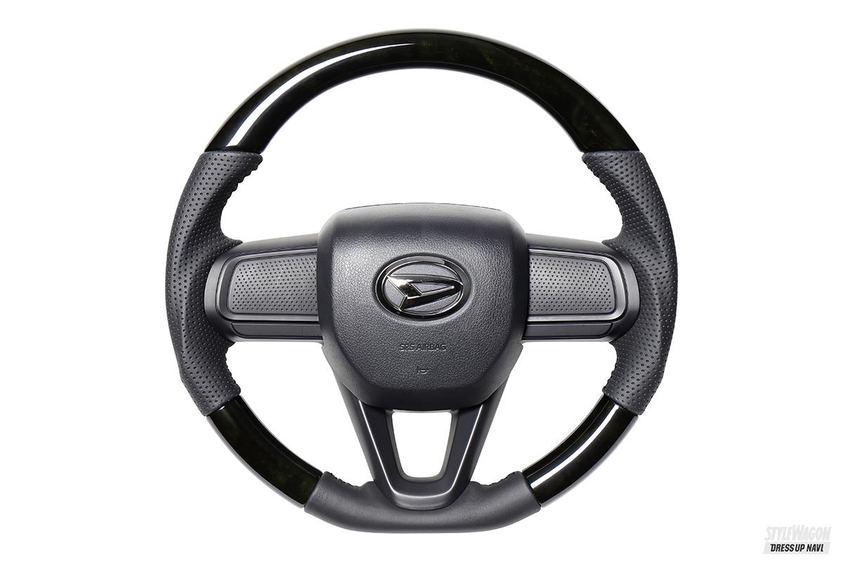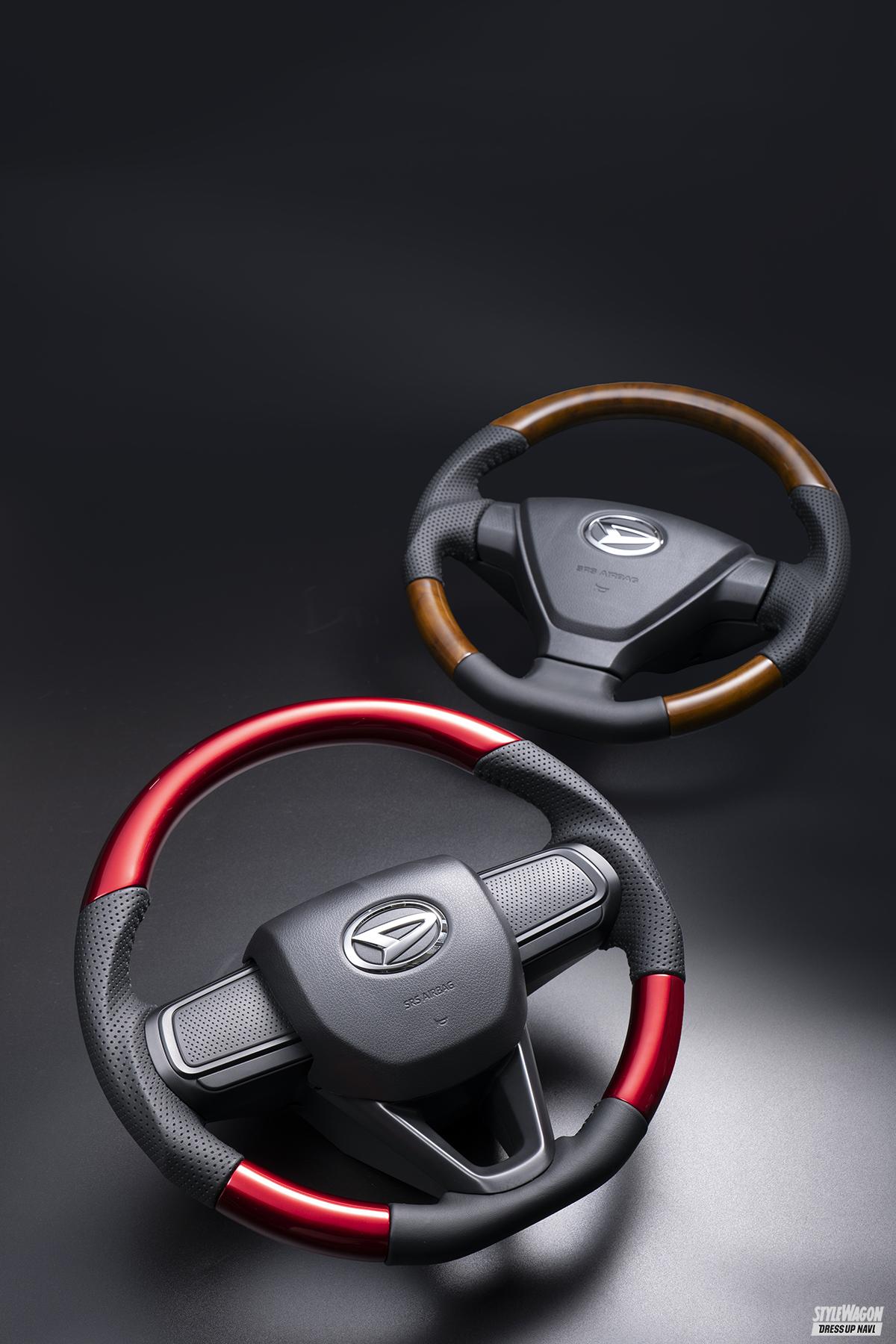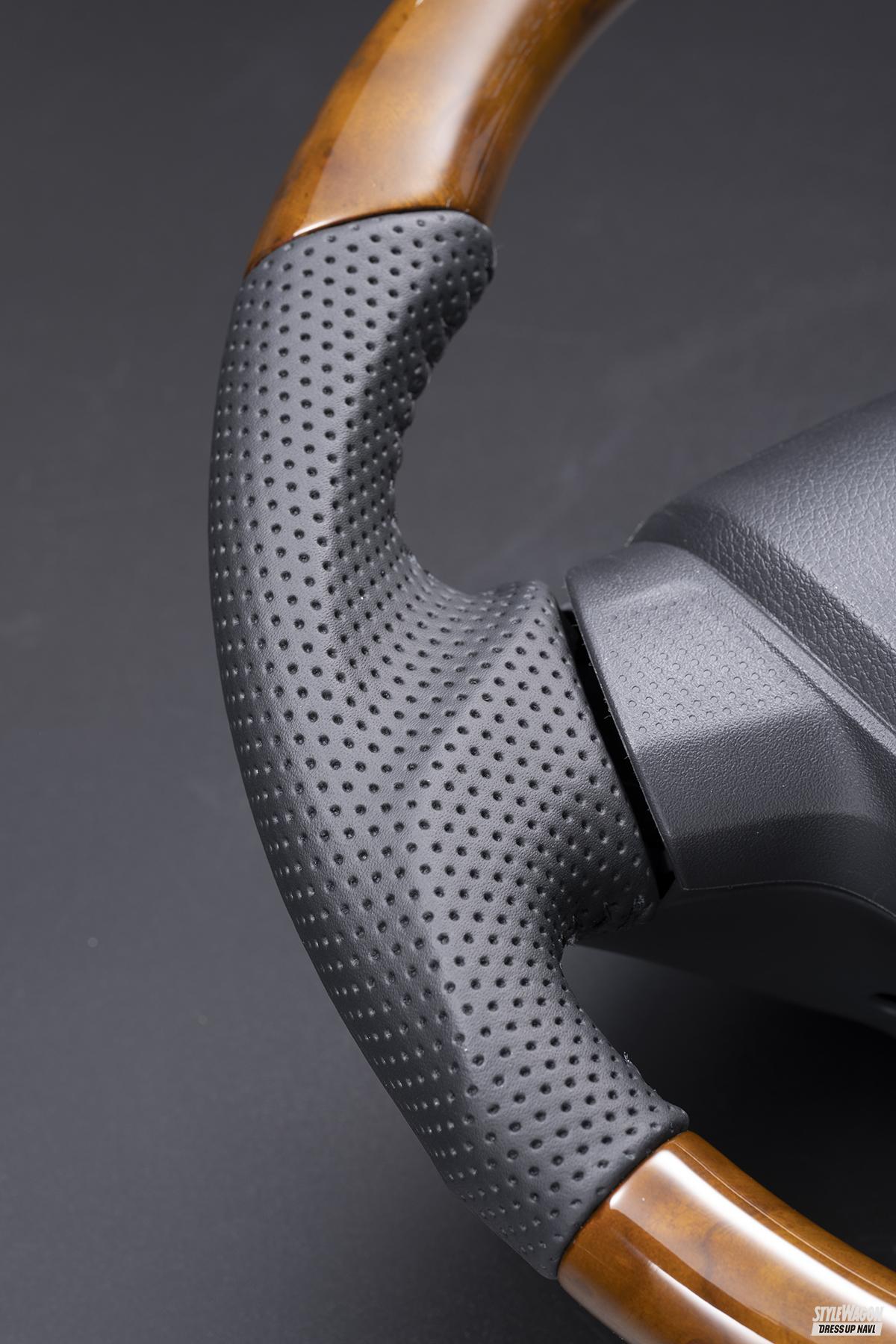 適合車種も豊富だが、現行アトレー&ハイゼットカーゴ用も設定。ゴージャスなコンビタイプはもちろん、純正然としたオールレザーも用意。素材も妥協せず、レザーは高級本牛革を使い、ウッドは天然本木に8層クリア塗装を施す。カーボンは何と35層クリア塗装により、奥行きのある仕上がりを実現。他には先代ハイゼットカーゴ後期(下の3タイプ)、先代アトレーワゴン後期(6タイプ)用もあるからユーザーは要チェック。