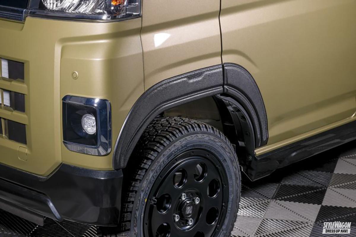 現行アトレー&ハイゼットカーゴ用パーツもかなり充実している。エクステリアはショートタイプのフロント&リアバンパーを設定。この車種でアゲ仕様のバンパーエアロは珍しいだけに注目度は高い。フロントは両サイドを切り上げたショートタイプで、アンダーガード風のデザインを施したのが特徴。撮影車両のように塗り分けで個性を出すのも楽しいだろう。リアもショート仕様となっており、テールランプの脇にダクトを設けてスポーティな雰囲気を与えた。このバンパーの良さが際立つ足まわりパーツも豊富だから、セットで決めるのがオススメだ。他にもゴツさ全開のグリルガード、さり気ない出幅のオーバーフェンダーなど様々なアイテムを設定しているから要チェックだ。
