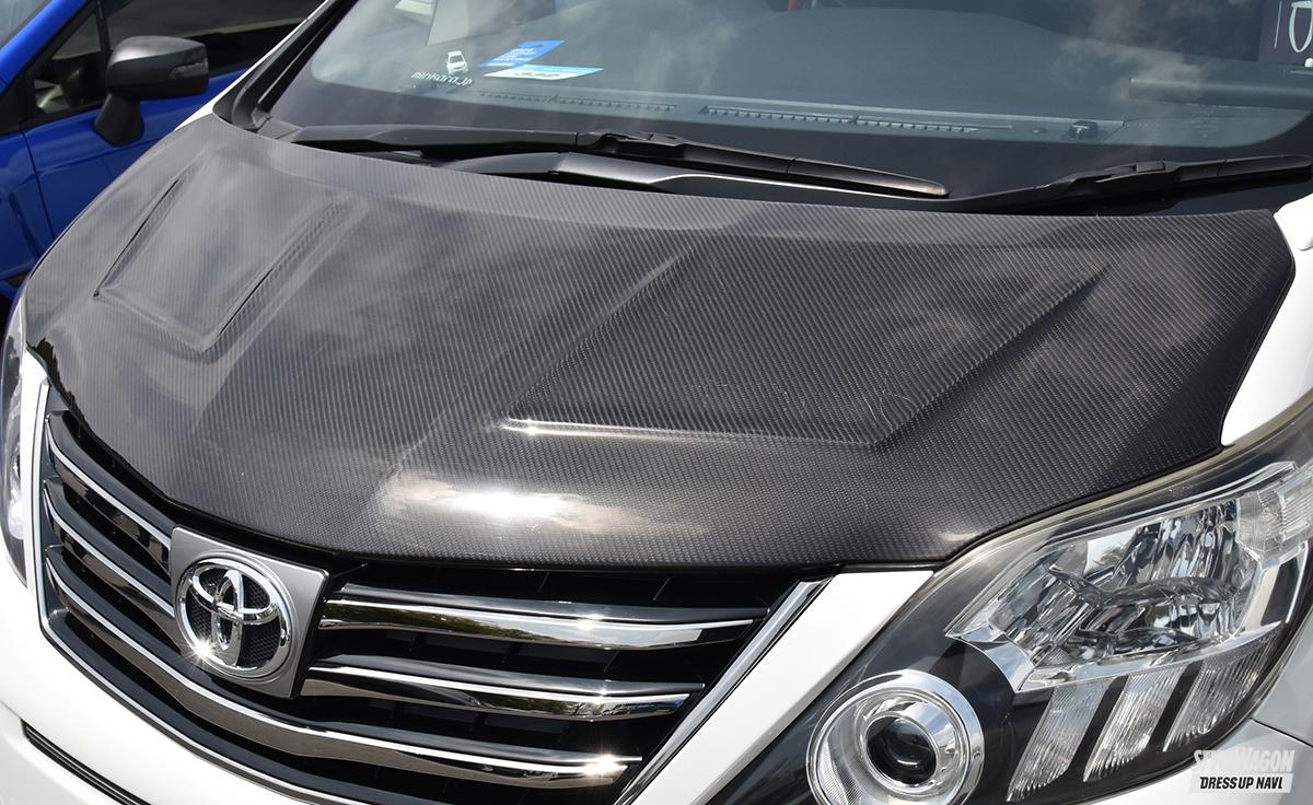 お父さんが乗っていた20アルファードを受け継いで11年というおすしさん。外観には友人に製作してもらったワンオフカーボンボンネットなど、リアルカーボンアイテムを多用。リアバンパーにはG’sを入れ、アフターアイテムとなるダブルディフューザー部をフォージドカーボン化している。「見た通り、スポーツ系を目指しています。ブレーキに車高調、そしてエアクリーナーはブリッツ。ボンネットやフォージドカーボンは板金をやっている友人に製作してもらっています。ボンネットのダクト風のデザインは鉄の棒を溶接してからカーボンを張っています。15年乗るのが目標なので、後4年は頑張ります。内装はほとんど手を入れていないので、今後はレカロシートなど入れたいですね」。