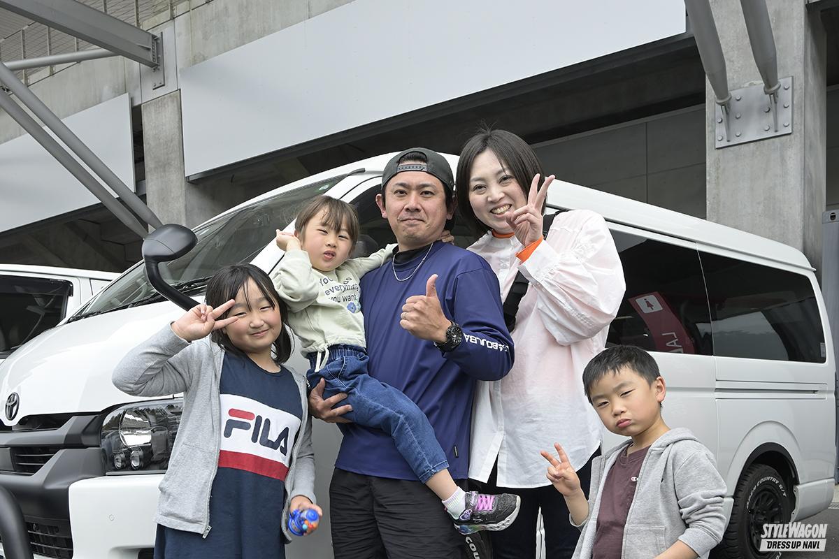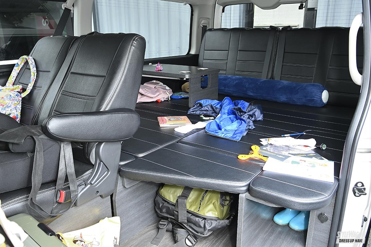 前車もハイエース(ナローの二駆)で、ソチラはとくに架装していたワケではないという。家族で遊びに行くために、当車に乗り換えた。購入時の条件は、ウインタースポーツもやるので四駆であること、両親と一緒に出掛けることもあるので5人乗りではダメ。そして結局、ディーラーで新車をオーダーすると納期が長いので、フレックスのコンプリートカー(10人乗りのワイド×ミドル)を選択した。テールランプまで各部を仕上げての納車だったが、その際ホイールは「カタチ、ブランド力からオーバルを選んだ」という。後席部はお座敷仕様にもなり……。この日も前乗りして車中泊を楽しんでいたそう!