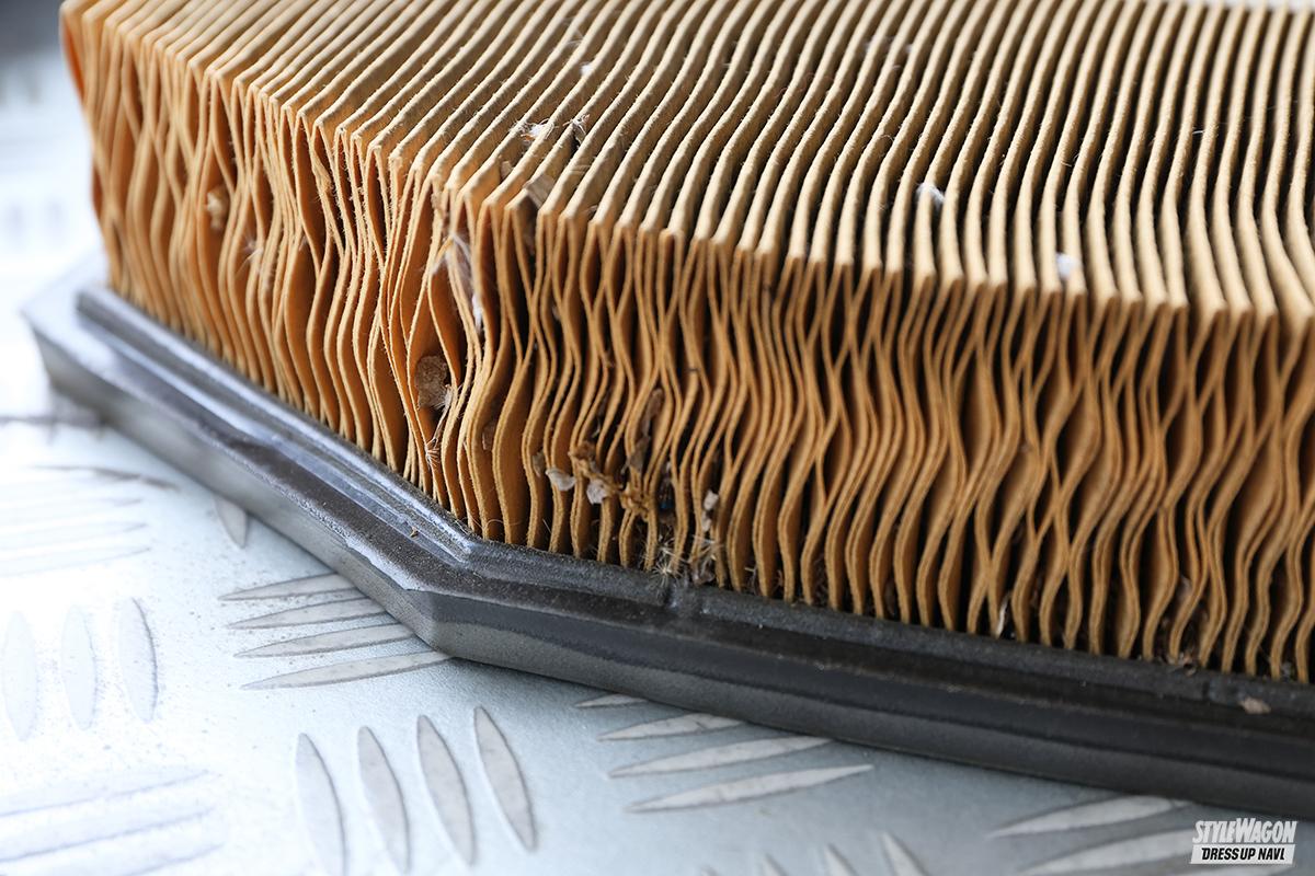 10万km超えの中古車に装着されているエアフィルターをチェック! と、まあなかなかの汚れ具合だったので、サード製の新品に交換。エアクリボックス内にもゴミが入っていたので、もちろんクリーニング。これで良い感じのフレッシュエアをV6エンジンに取り入れることができる。