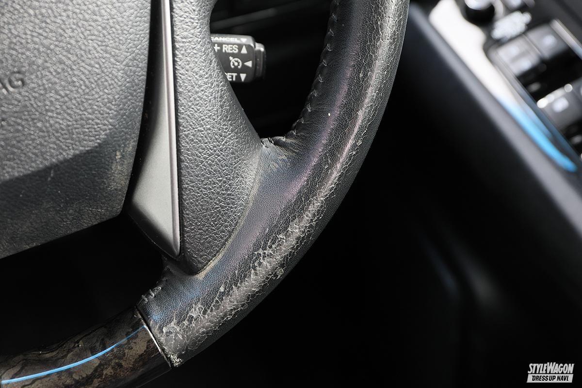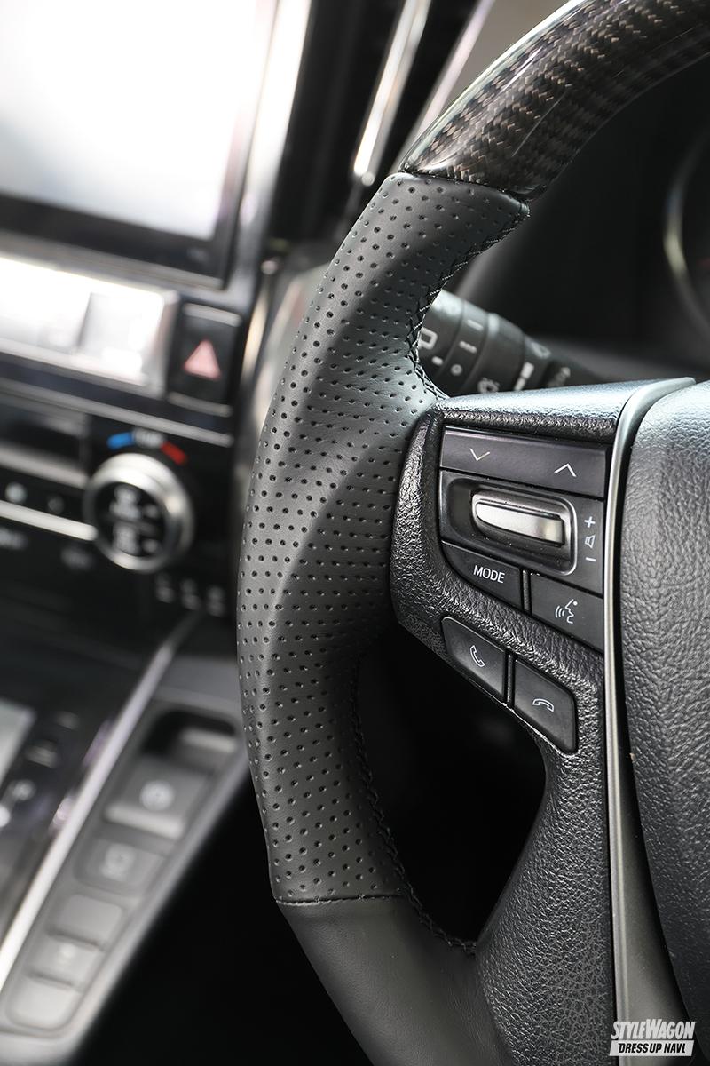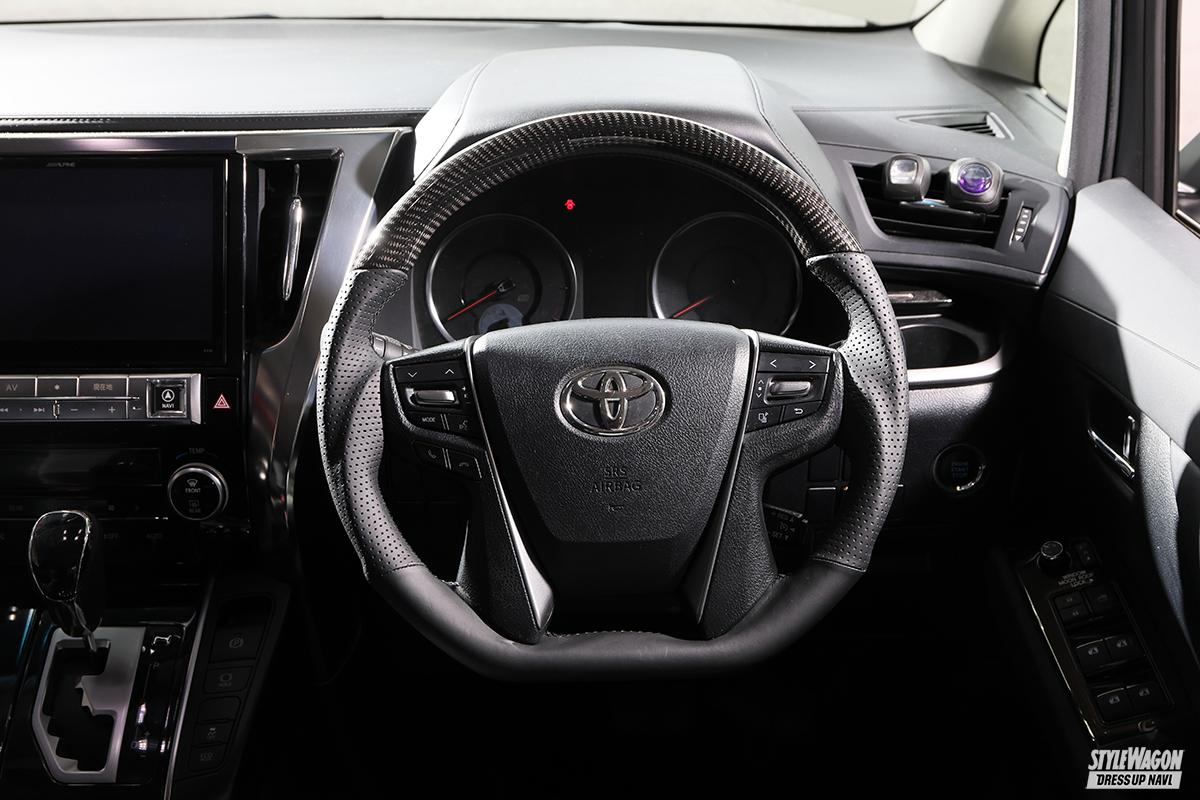 走行距離10万kmオーバーとなると、純正ステアリングの疲れ具合がどうしても気になってしまうところ。マサさんも「運転中は常に触っているところだし、めっちゃ気になる」と、品質の高さに定評のある「レアル」のプレミアムシリーズ・ステアリングに交換。本カーボン+35層のクリア塗装で仕上げたハンドル部はプリント系とは明かに違う上質なもの。プレミアムシリーズに使われている高級本牛革「ナッパレザー」は手に馴染む柔らかさで握り心地抜群。次ページで紹介しているブリッドのシートとともに30アルファードのコクピットが一気にグレードアップした。