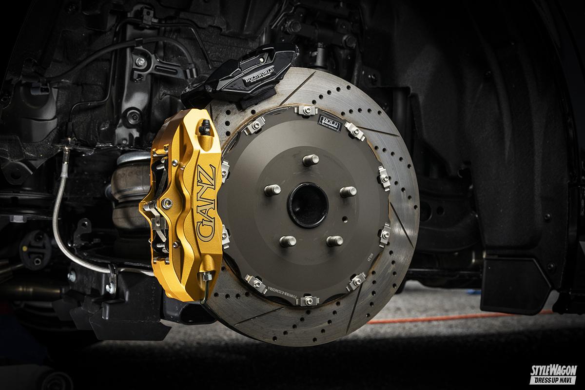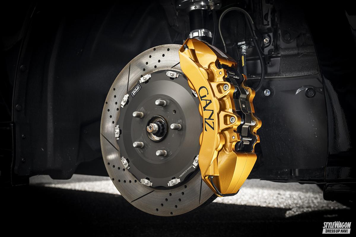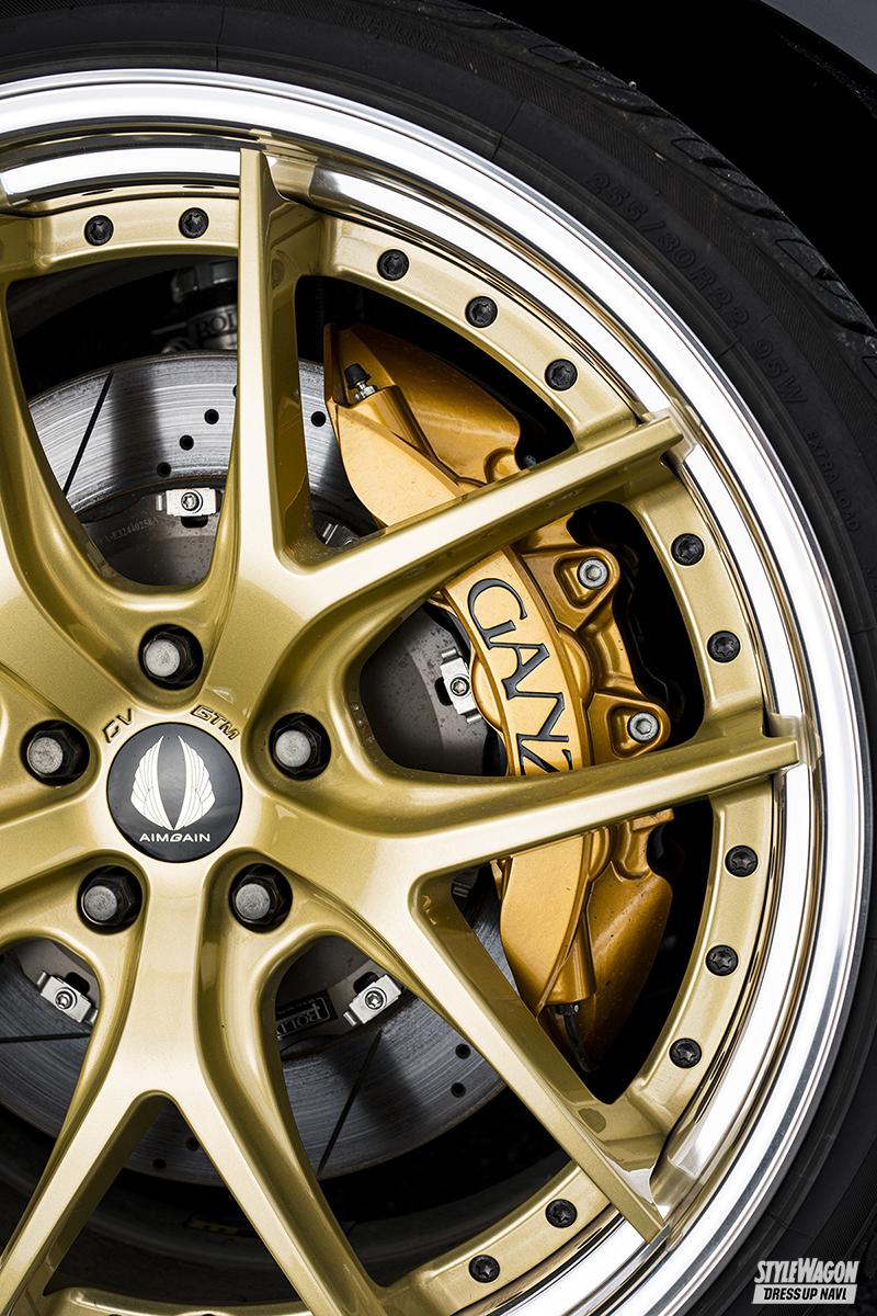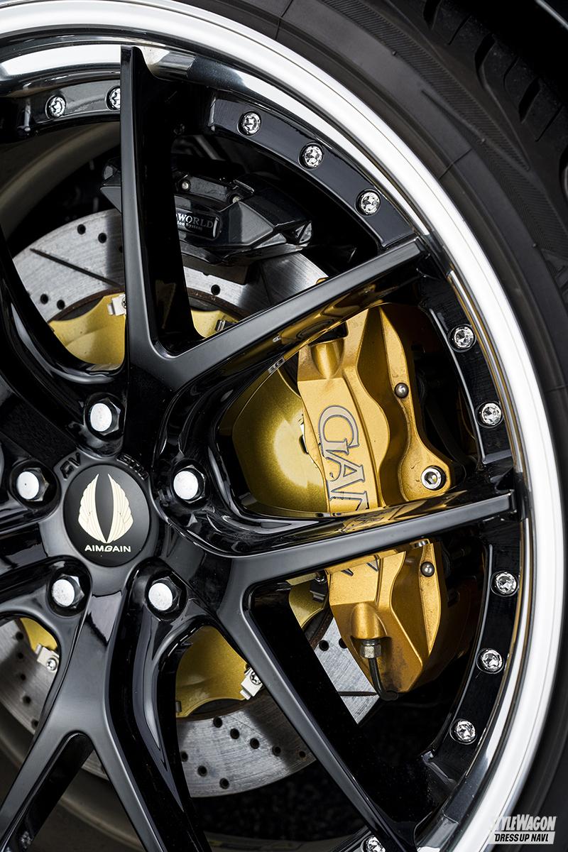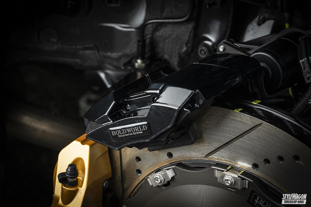 そんな車高調とともに、ボルドワールドがカスタムユーザーに提案するのが、ブレーキシステム「ガンツ」。インチアップをすることで、一般的にはタイヤ&ホイールの重量が純正よりも増加するため、ブレーキの効きは悪くなり、制動力にも悪影響を与える。ガンツは、ビッグキャリパー、大径ローター、ステンメッシュブレーキホースをセット化した車種別のフルブレーキシステムで、圧倒的な制動力アップにより安心のドライビングを実現する。また、ホイールの隙間から見えるゴールドのビッグキャリパーは、見映えアップの効果も高い。機能パーツであるとともに、足元をさらに引き立たせるカスタムパーツでもあるのだ。