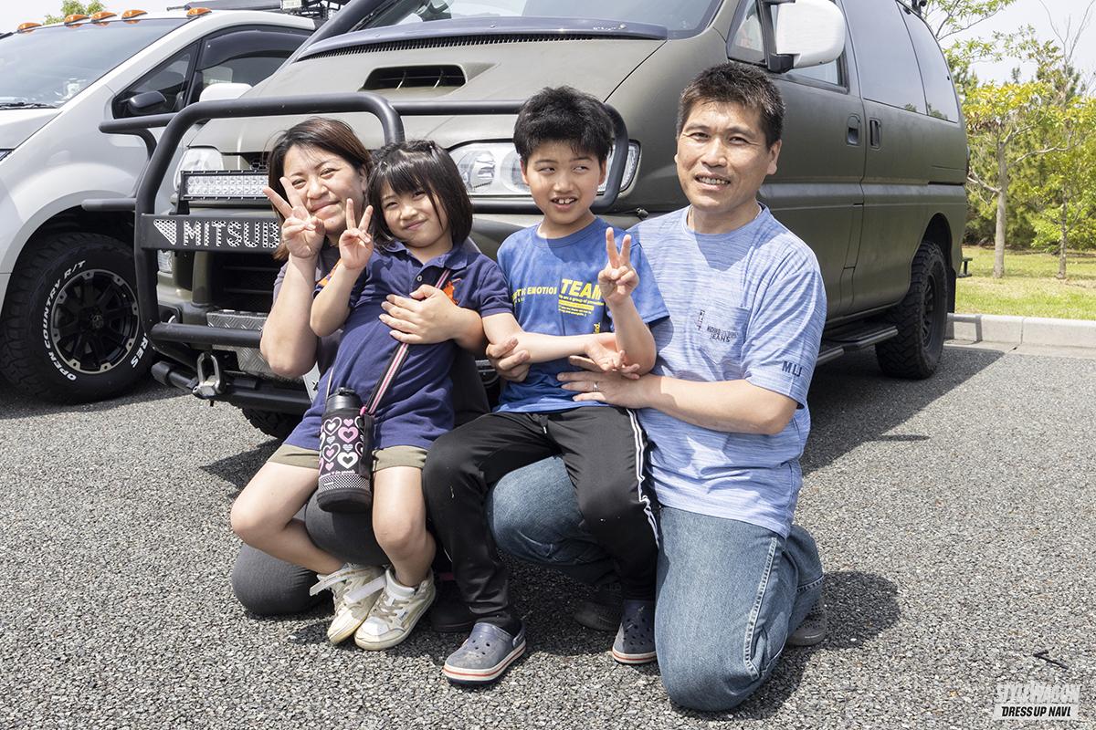 オーナー歴は13年。DIYによるカスタマイズを存分に楽しんでいる、今見堂さんのスペースギア。ボディカラーやリアのドラム缶型収納ボックスの演出効果もあってか、どことなく軍用車的な雰囲気も漂わせている。奥様の則子さんに蓮人クン、楓チャンと、お出かけする際はいつもみんな一緒という超仲良しファミリーなのだ。