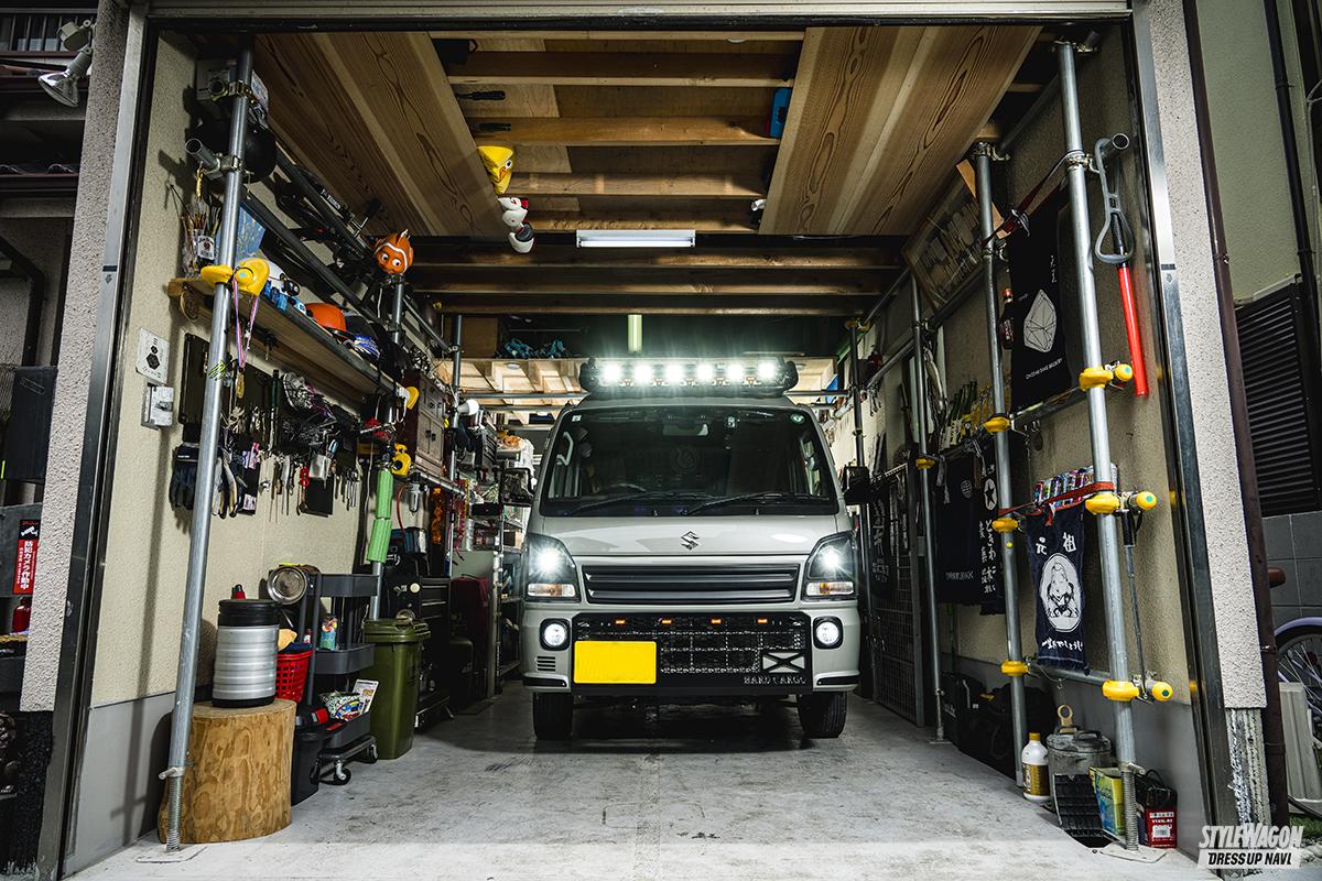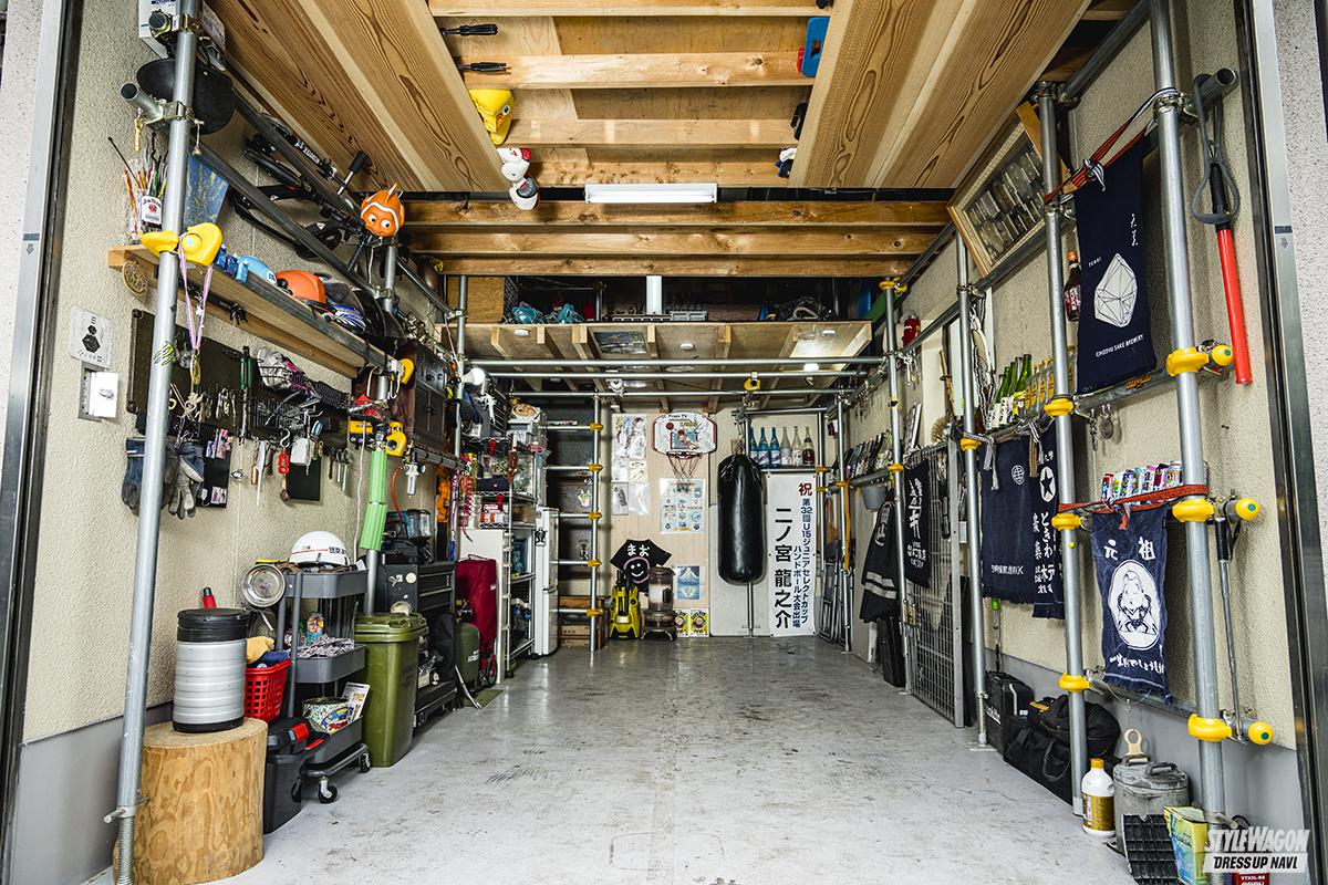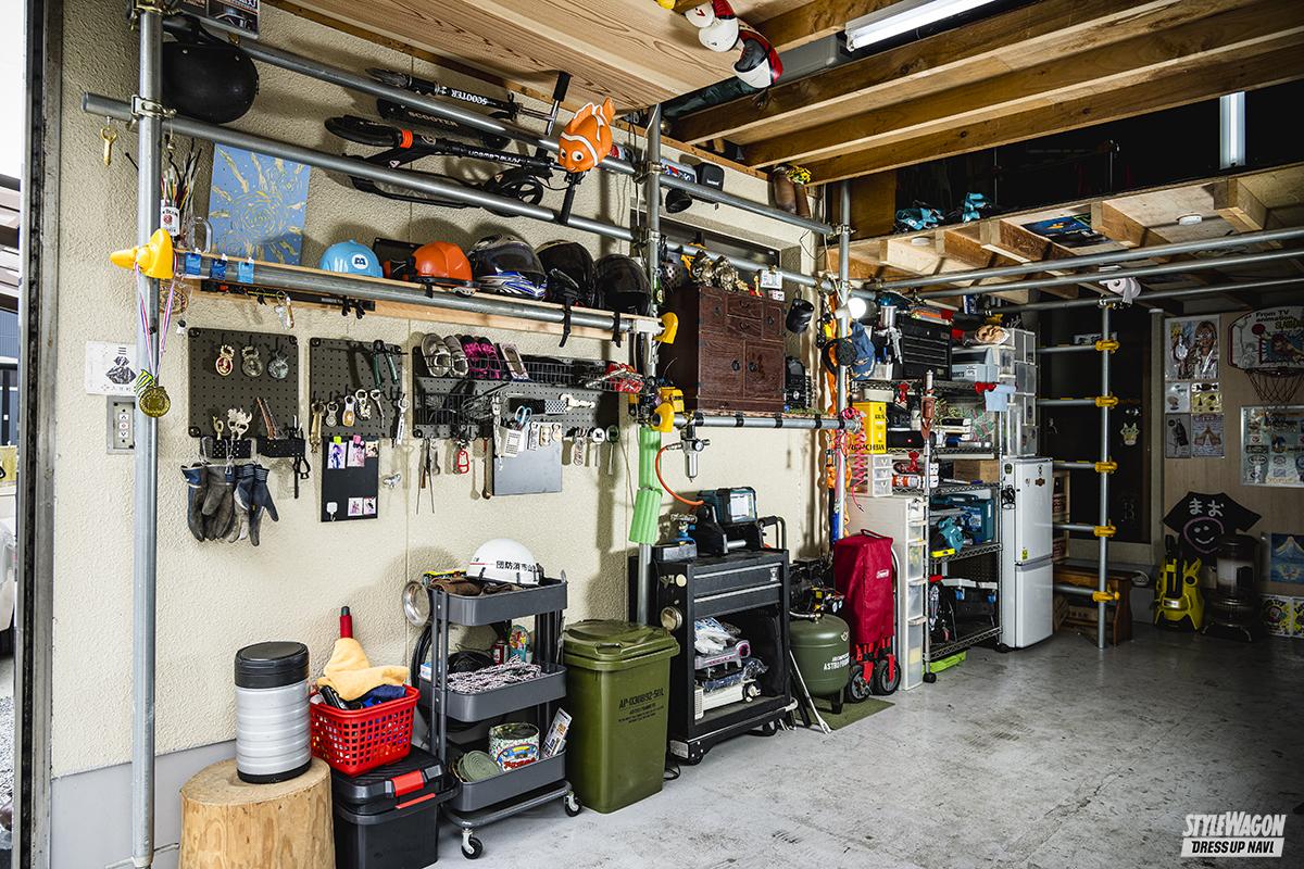 そんなスーパーキャリイの本拠地が、自宅横に設けられたガレージ。建築系の仕事もこなすだけに、建築用のラックを組み、木材を張り、工具から趣味のアイテムまでをキレイに展示収納するスーパーDIYのガレージとなっている。ガレージ奥には「秘密基地」と呼ぶ隠し2階があり、仲間が集まっては愛車を眺めながらの酒盛りも行われているらしい。憧れの「男のガレージ」は、車庫というよりも大好きな愛車や友人と楽しい時間を過ごすための、大切なスペースとなっているようだ。