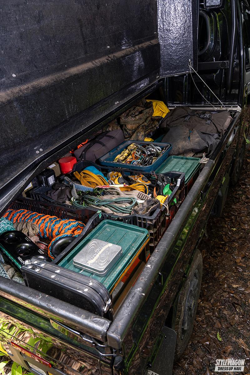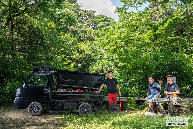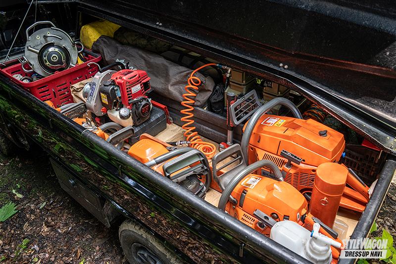「仕事柄、チェーンソーだけでなくガソリンを運ぶことも多いんですよ。なので密閉されたワンボックスタイプよりもピックアップタイプの軽トラを選びました」と上野さん。