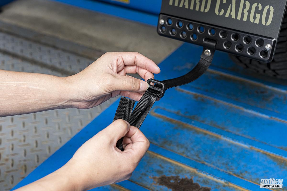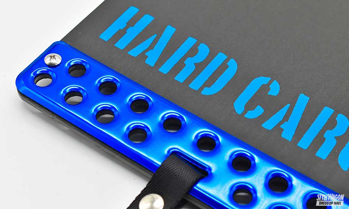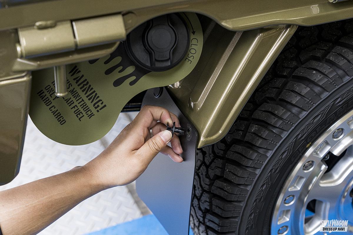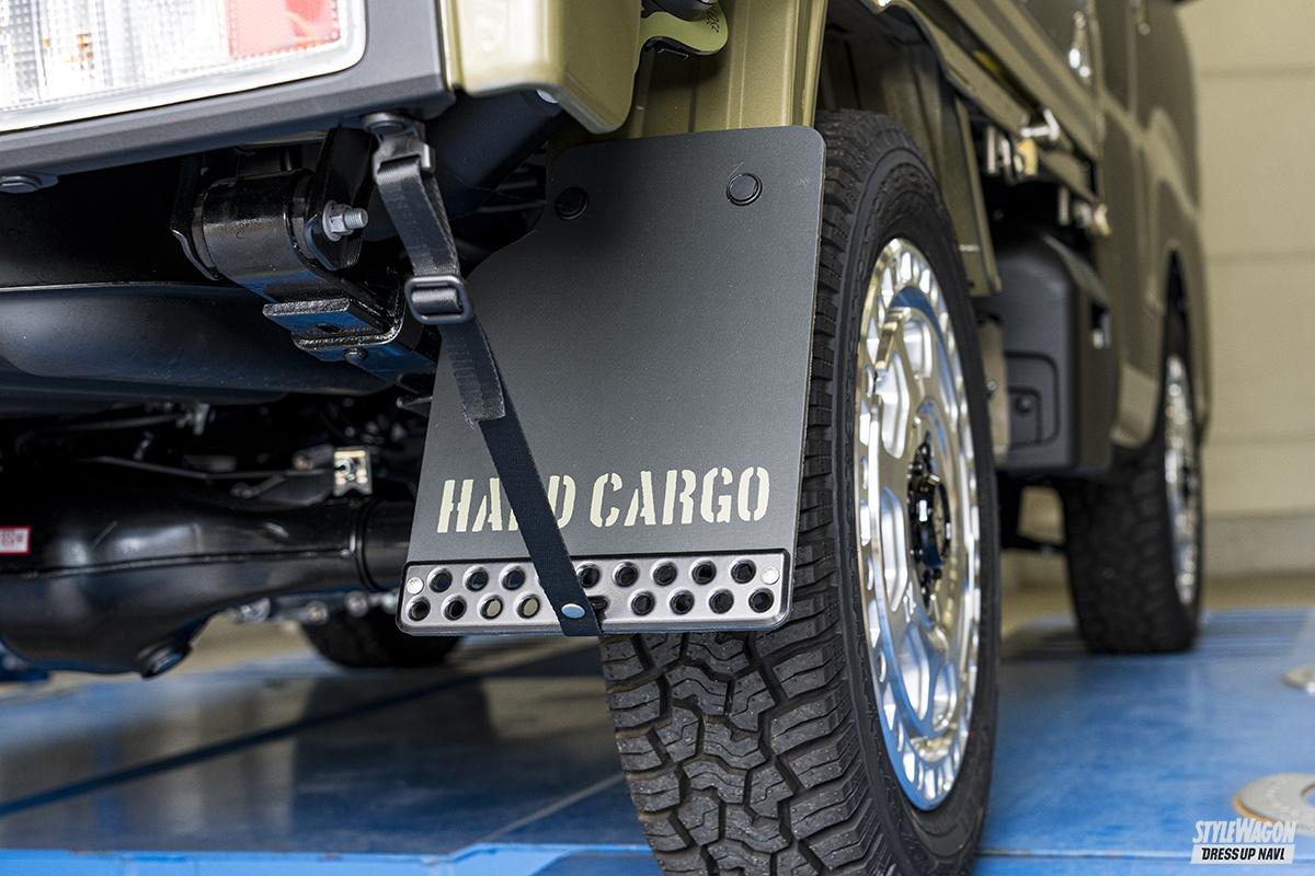 どの軽トラにも付いているリアの泥よけ。しかし純正品だからあくまでも実用に特化した作りで、飾り気はない。荒々しいオフロードスタイルを目指すなら、大きなマッドフラップを付けたいところ。ハードカーゴのマッドフラップは軽トラ専用設計で、純正泥よけと交換するだけだから簡単にイメージチェンジできる。純正よりも大きなフラップにはハードカーゴのステンシルロゴが入っており、その下には丸穴が開けられたアルミプレートが付属。プレートはアルマイト加工を施しているためキレイな色合いがポイント。ベルトで吊っているのも見ごたえあり。