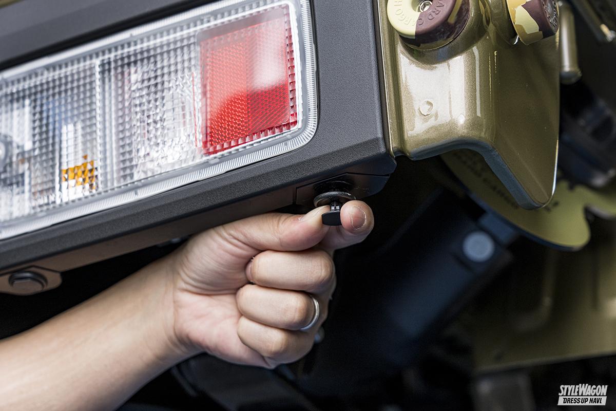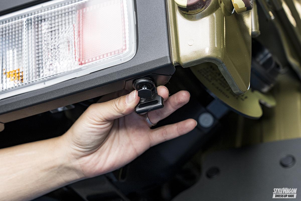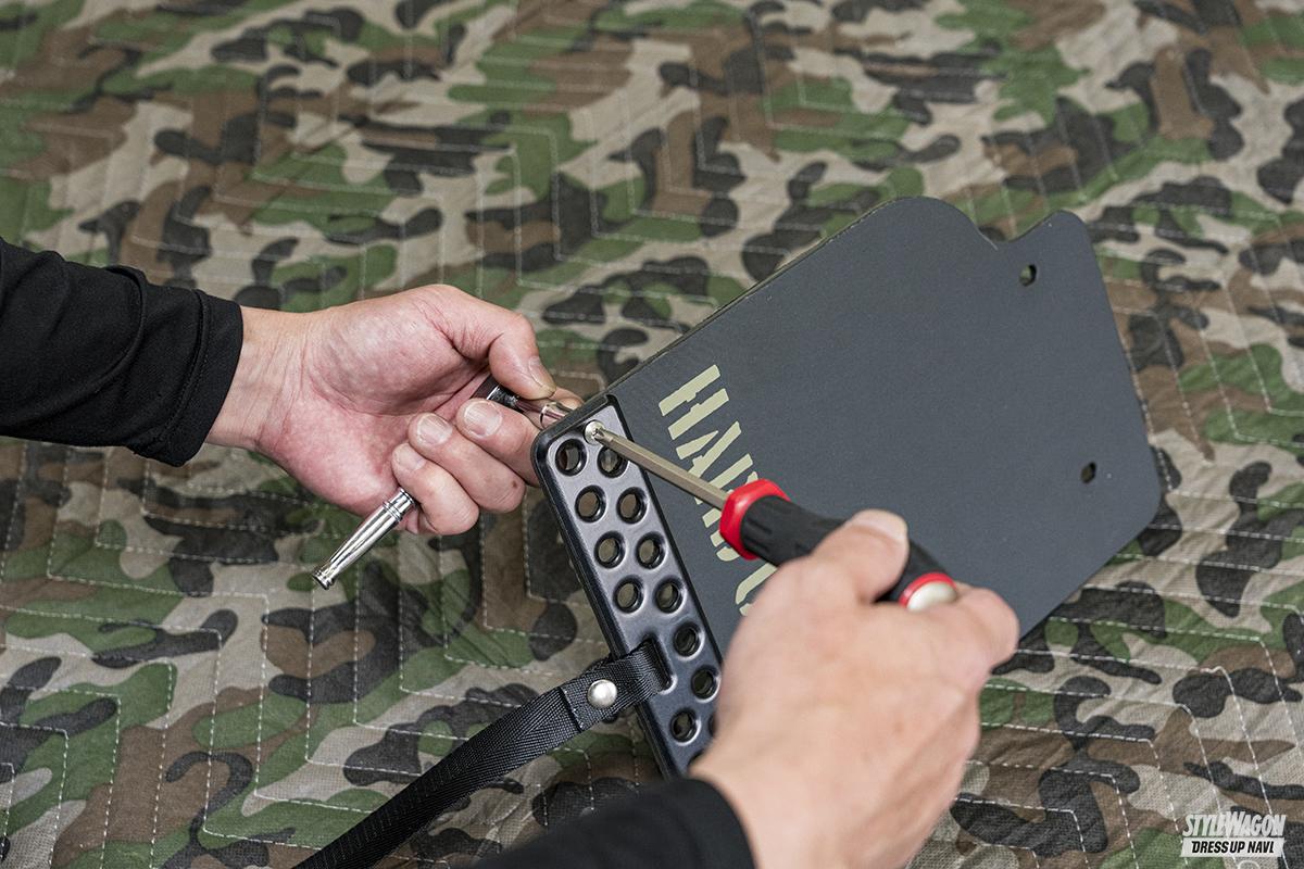 どの軽トラにも付いているリアの泥よけ。しかし純正品だからあくまでも実用に特化した作りで、飾り気はない。荒々しいオフロードスタイルを目指すなら、大きなマッドフラップを付けたいところ。ハードカーゴのマッドフラップは軽トラ専用設計で、純正泥よけと交換するだけだから簡単にイメージチェンジできる。純正よりも大きなフラップにはハードカーゴのステンシルロゴが入っており、その下には丸穴が開けられたアルミプレートが付属。プレートはアルマイト加工を施しているためキレイな色合いがポイント。ベルトで吊っているのも見ごたえあり。