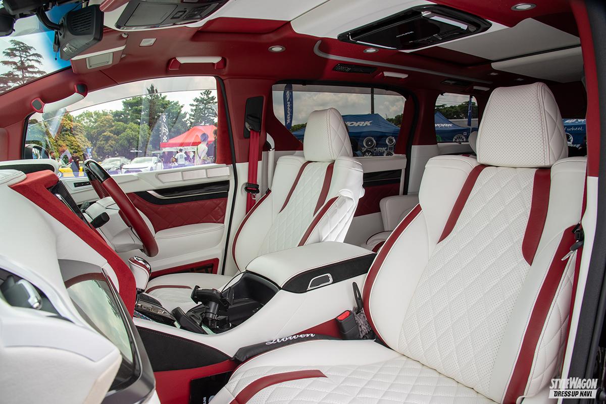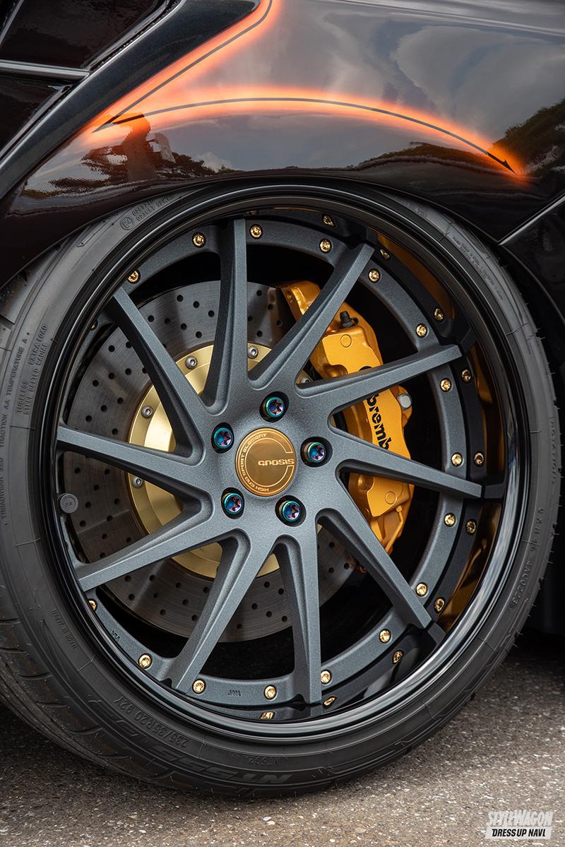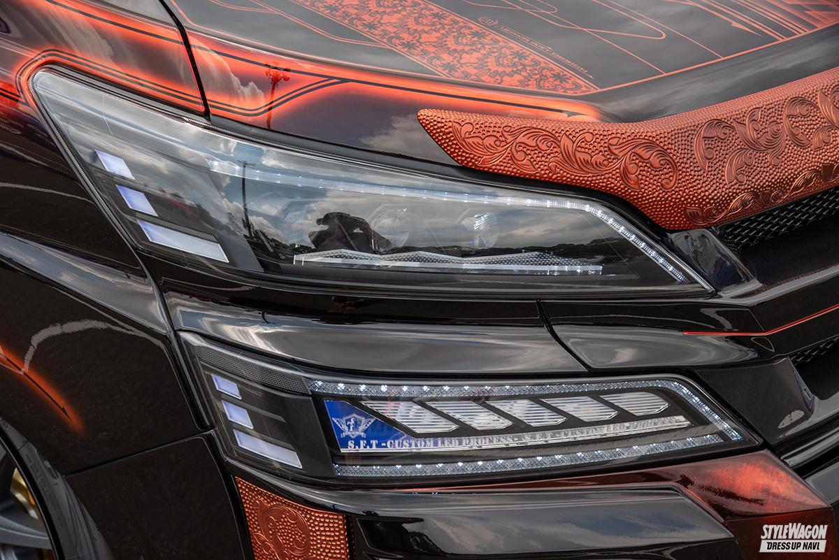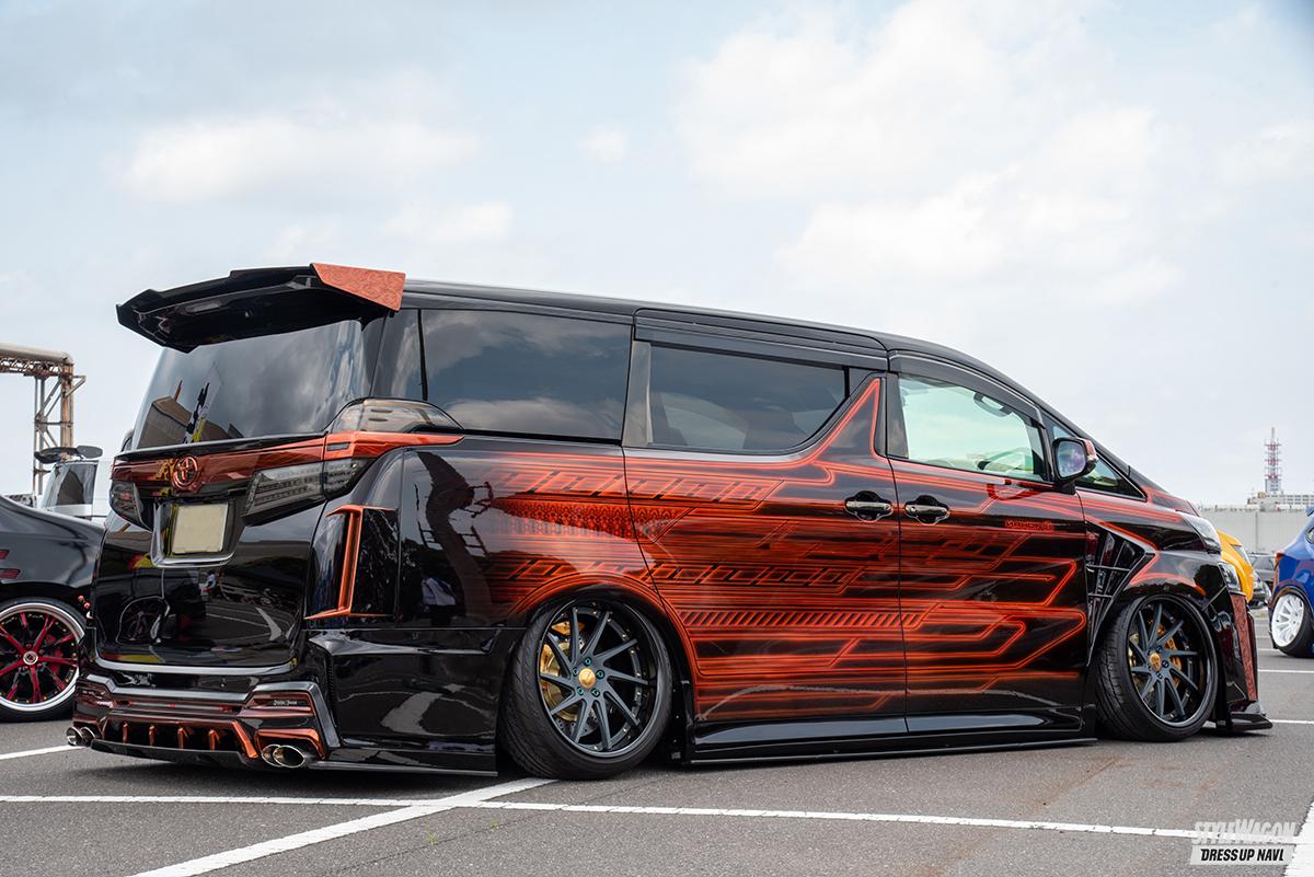 10アルファードから20ヴェル、そして30ヴェルと各世代を乗り継いできた三浦さん。カスタムのベース車としても人気の車種であるため、他車と同じにならないようサイドとリアをアドミレイションとクールのミックスエアロにするなど工夫。ほかにもボンネット、ヘッドライト、テール、マフラー、内装をワンオフして、オンリーワンのスタイリングを目指している。足まわりはボルドワールドのエアサスで、故障が少ないことから長く愛用。