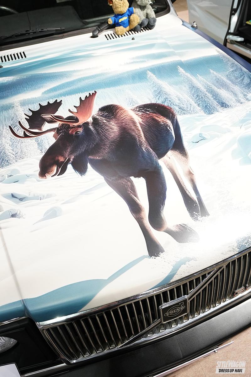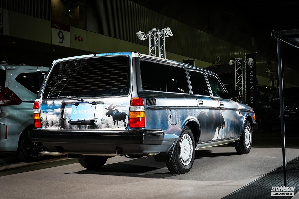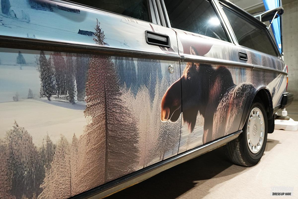 240サバイバルに続いて紹介するのはヘラジカのエルクをデザインしたフルラッピングの「AIラッピング240 エルク」。こちらも240サバイバル同様に、生成AIで製作されたラッピングを施工。「ボルボはスウェーデンのクルマで、ヘラジカがボルボ社のマスコットにもなっているんです」と幻想的な極寒の北欧イメージで生成AIに入力して製作された。ちなみにボルボ240シリーズは1993年まで約20年間販売されたクルマ。一番新しい年式で31年モノとなる旧車なのだが、VOLTSでは「一目でわかるカクカクしたフォルム。これぞザ・ボルボで、現在でも人気が高いんです」とベース車とすることに。古い車ではあるが、まだ十分に魅力のあるクルマなのだ。VOLTSでは北米仕様となる丸目4灯や古いタイプ丸目2灯を再現したアイテムやシートの張り替えを本革、ファブリックともに設定するなど、240の魅力を再構築できるアイテムを用意している。ちなみに1990年式あたりで補償をつけた乗り出し240万円ほどから。