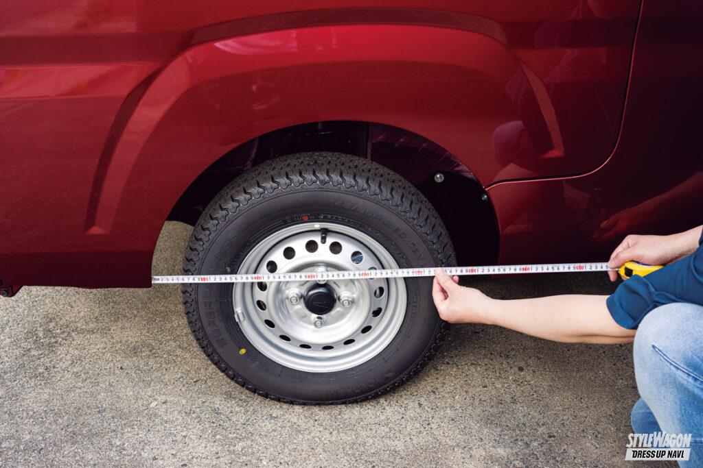 A. 現行のハイゼットとキャリイは上げ方がほぼ同じです。しかしフロントのタイヤハウスの広さに違いがあり、履けるタイヤサイズも大きく変わってきます。たとえばハイゼットならノーマル車高でも165/60R15(外径579ミリ)を履けなくもないですが、キャリイは2インチアップしても厳しい。4インチアップでようやく履けるといった感じで、大径タイヤを装着しにくいです。でも走りはキャリイがいいんですよね。低速からトルク感があり、5MT車は1速から5速までバランスよく繋がります。一方でハイゼットは3速から4速、4速から5速も離れているので、引っ張って繋がないと失速します。どちらも一長一短です。