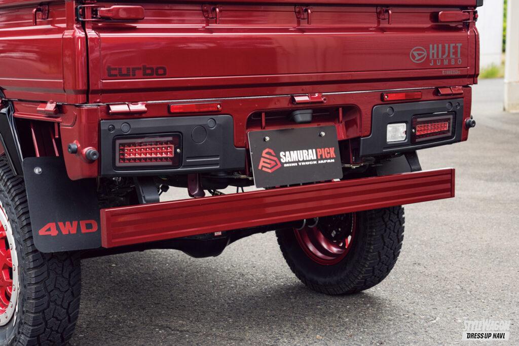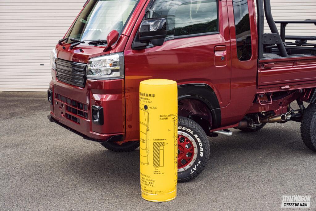 A. 2021年9月以降に製造された軽トラは、後部突入防止の保安基準が厳しくなります。この法規はとてもややこしいのでざっくりお話します。軽トラの場合、地面からリアバンパー下縁(というかテールランプの下あたり)までの高さを550ミリ以下にしないとダメで、それを超えた場合は何らかの「後部突入防止装置」を取り付けて550ミリ以下にしてね、というものです。だいたい2インチアップしてそれなりのタイヤを履かせると550ミリ以上になるので、このあたりから対策が必要。4インチアップなら必須です。当店ではオリジナルの突入防止バーを用意して対策しています。