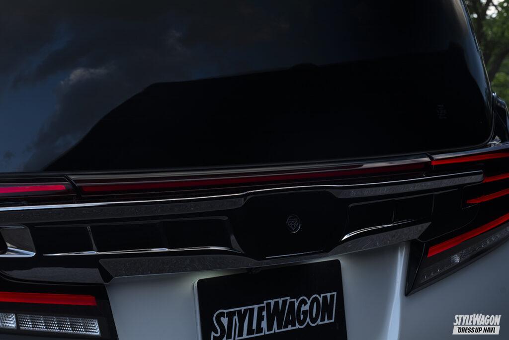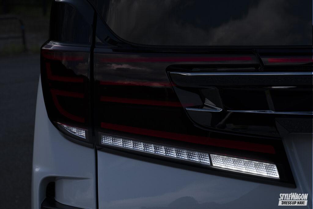最大の見せ場は新型車を中心に採用が進む横一文字ルック。純正とは明らかに違う確かなカスタム感を強く打ち出した。レッドラインを描くファイバー部は、細く鋭く近未来的なライティングシルエットを演出。このファイバーパートは独特のテクスチャで、非点灯時の存在感も高いのがポイントだ。横一文字ラインを描く、センター部は点灯のON/OFFが選べるので、さらなる個性化も可能。