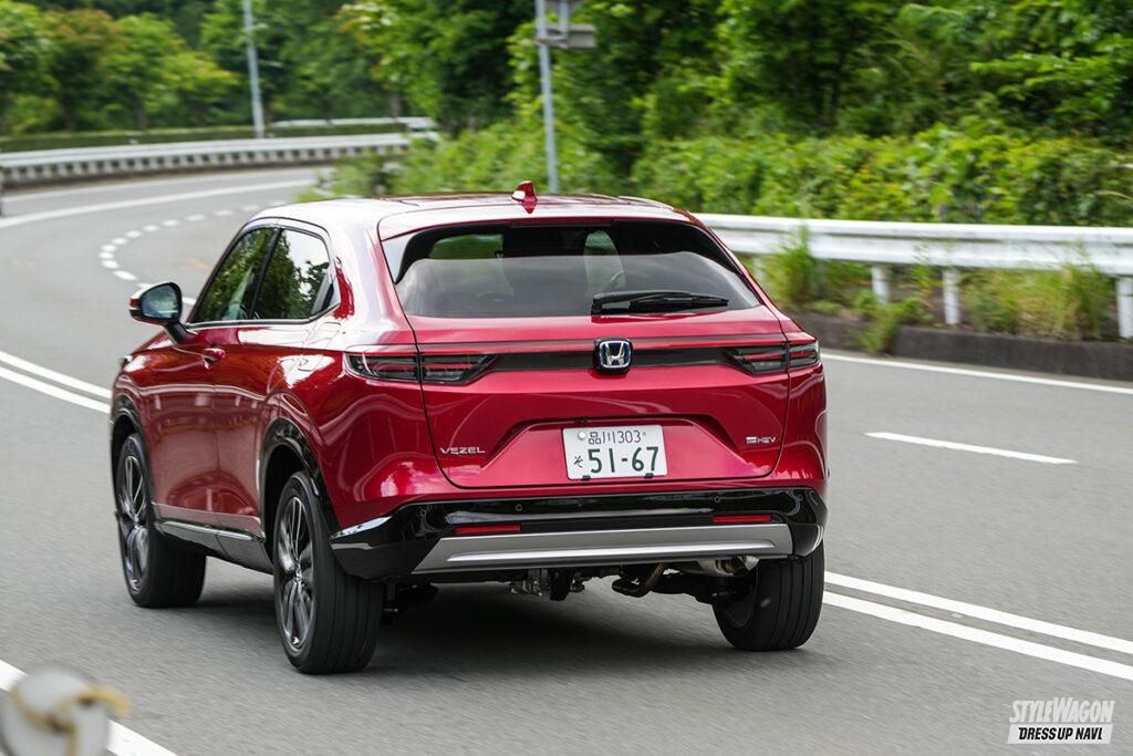 ひさびさにヴェゼルを運転してちょっと驚いた。峠道の深く曲がり込んだコーナーで、ハンドル操作に応じてノーズがどんどん内側へ向き、グイグイ曲がる感覚が爽快なのだ。同じ道で2WDと4WDでも試してみたけれど(いずれもハイブリッド車)、キビキビ曲がる感覚は同様。ヴェゼルって意外なほどにコーナリングマシンだということを再認識させられた。