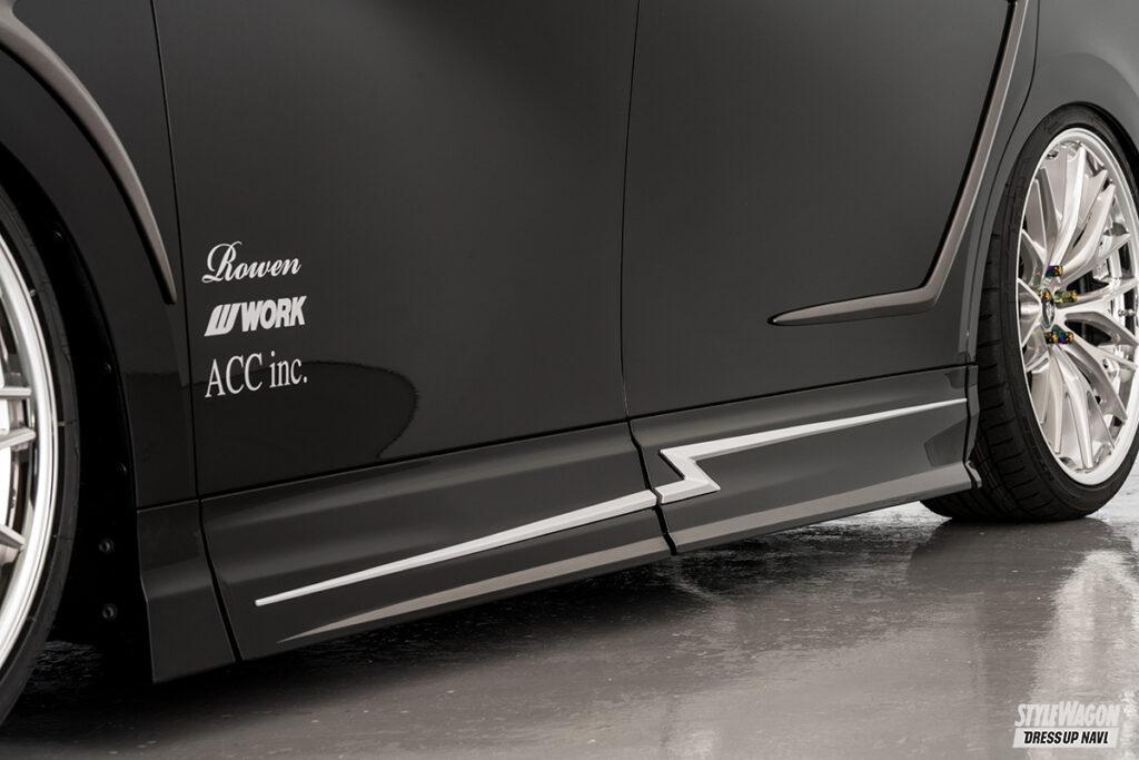 今回紹介するエアロはハーフタイプ。ハーフはデザインの限界値が低く控えめとなりがちだが、ロェンは凹凸を明確に効かせエッジを立てるなど、培ってきた知見を元に自己主張の強いカタチを具現化した。各部に盛り込んだLEDは、入れることだけに満足せず光らせ方でも差別化。アクセントとしてクロームメッキを適所に投入するなど、“見られている”ことをつねに意識したモノ作りが光る。ボディ側面で展開する新開発のエクステは個を強調する顕著な例で、マエストロにかかればご覧の通り。絶妙なバランスで仕上げきるセンスの良さは、今作でも遺憾なく発揮されている。