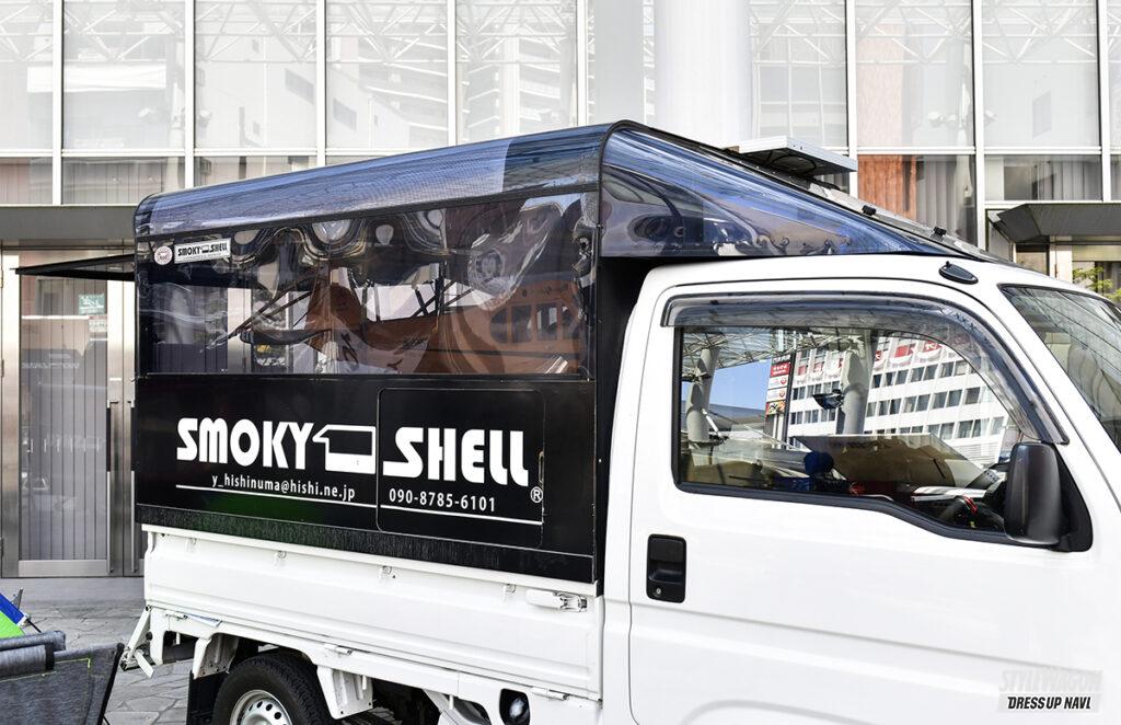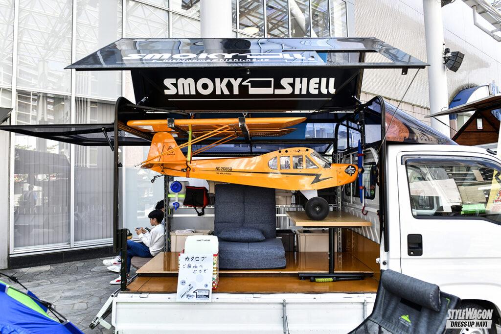 「家電店が本業。冷蔵庫を配達するときだけ軽トラを使っていて(軽バンには積めない)、普段も使えないものか…」(同社菱沼さん)ということで自作したのがスモーキーシェル誕生のきっかけ。コレに興味を示す人も多く、ならば「ちゃんと作って販売してみよう」と思ったのだ。当キットの基本はフレーム。そこにガルウイング、跳ね上げ開閉機構(1段・2段が選べる)、スライド式のドア等々を組み合わせて自分仕様を実現するスタイルだ。ちなみに、積載したラジコン飛行機は、菱沼さんの趣味なのです。