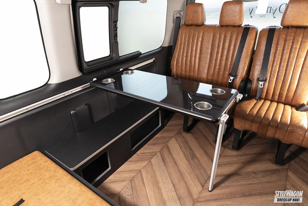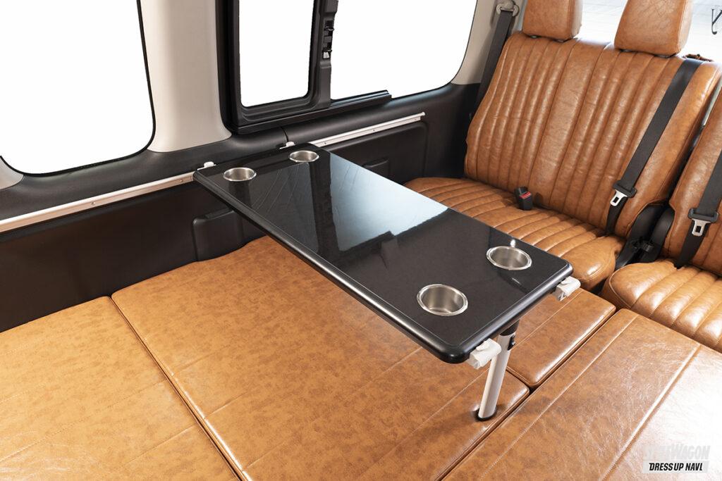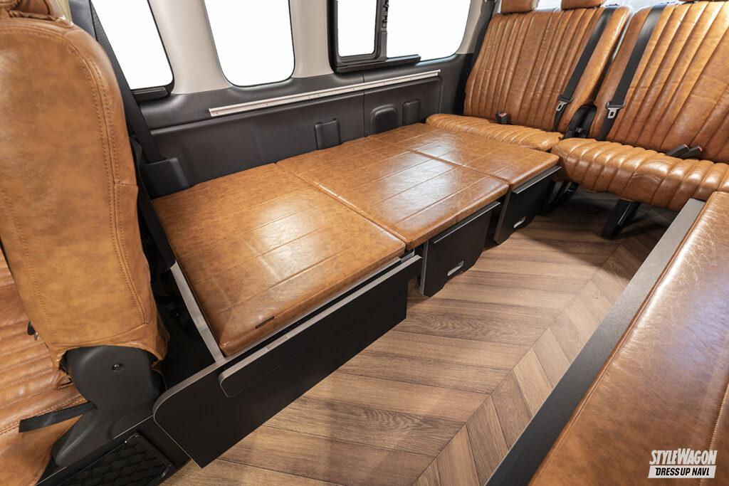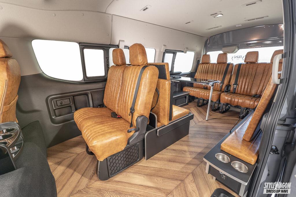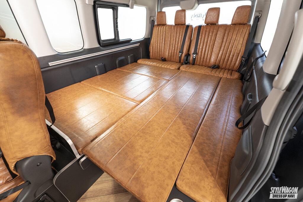 同社のハイエースでも人気のプランで、前向き8人+後向き2人の計10人が乗れるプランとなっている。一番の特徴は、ワイド&スーパーロングボディを最大限活用した広々とした空間。ベッドマットの展開によってフルフラットにしたり、セパレートベッド(ウォークスルー)にすることもできるので、車中泊にもってこい。オプションのテーブルも活用すれば、寝るだけではなく飲食などくつろいだ時間を過ごすことも可能だ。