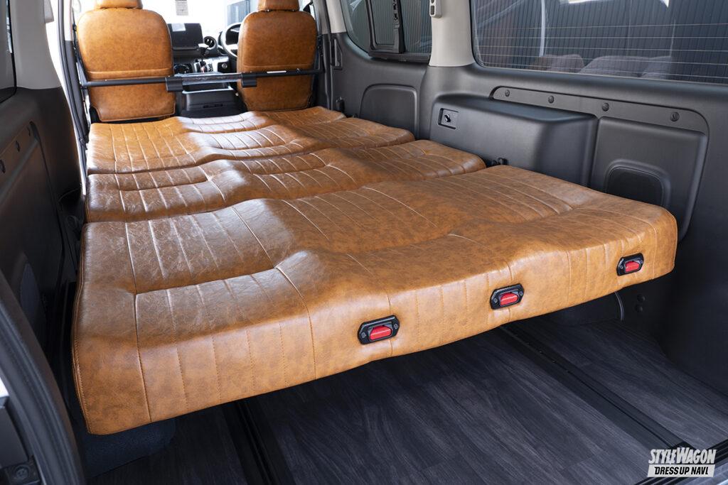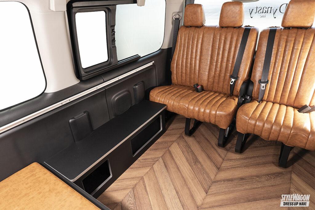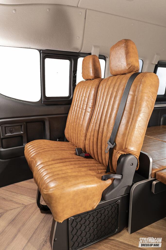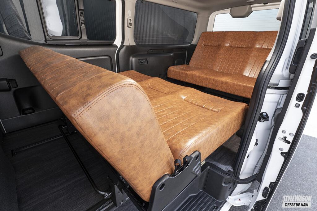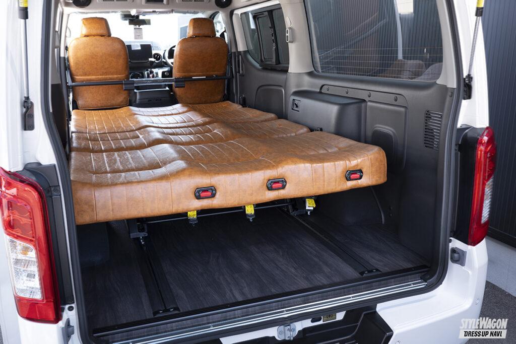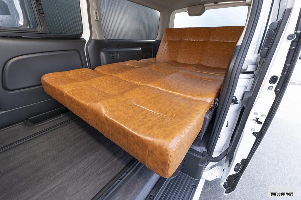 同社のハイエースでも人気のプランで、前向き8人+後向き2人の計10人が乗れるプランとなっている。一番の特徴は、ワイド&スーパーロングボディを最大限活用した広々とした空間。ベッドマットの展開によってフルフラットにしたり、セパレートベッド(ウォークスルー)にすることもできるので、車中泊にもってこい。オプションのテーブルも活用すれば、寝るだけではなく飲食などくつろいだ時間を過ごすことも可能だ。