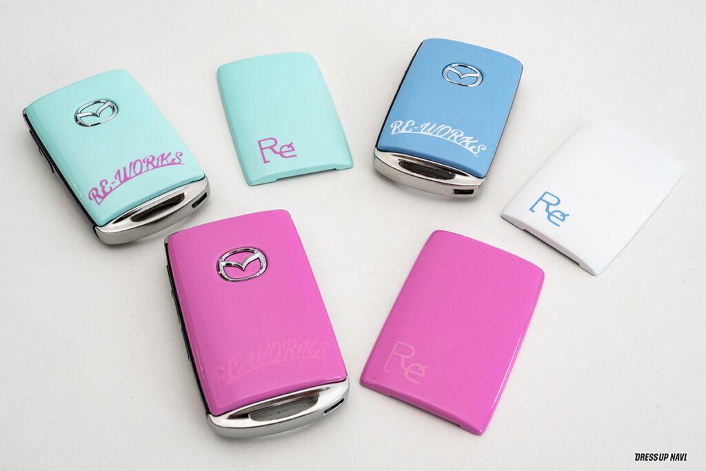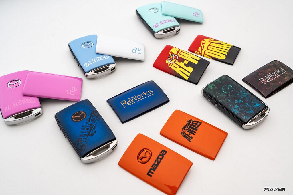 リワークスは富山の人気プロショップでありながら、マツダ車向けとなるオリジナルパーツも精力的に手掛けている。現在開発中となる最新作の「マツダキーシェルカスタム」は、CX‐5などのマツダ車に採用されているキーシェルパネルを、オリジナリティ溢れる仕様にカスタムできるメニューとなっている。既存のボディカラーにあわせたキーシェルであれば純正オプションとしても用意されているが、キーシェルカスタムであれば、既に販売終了となったモデルのボディカラーに合わせたり、好みのカラーや文字デザインを入れるなど自由自在なアレンジが可能。さらに、より特別感のあるキャンディペイントやクラッシュカーボン風など、ペイントカスタムを得意とするリワークスならではの仕様も実現できる。
