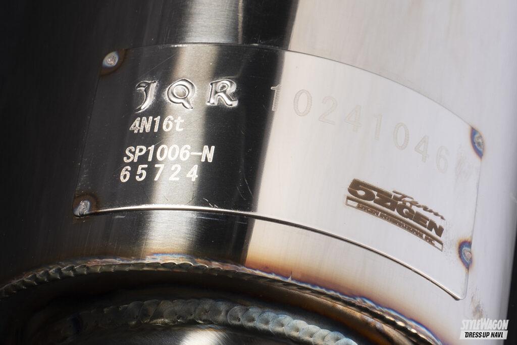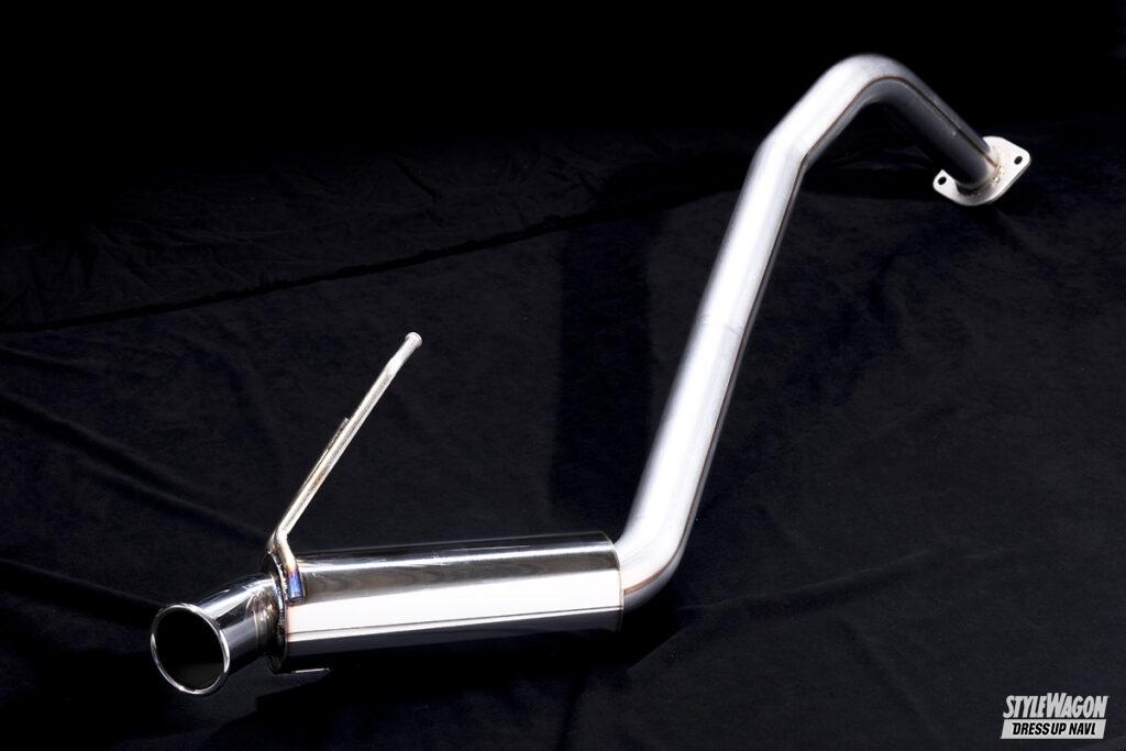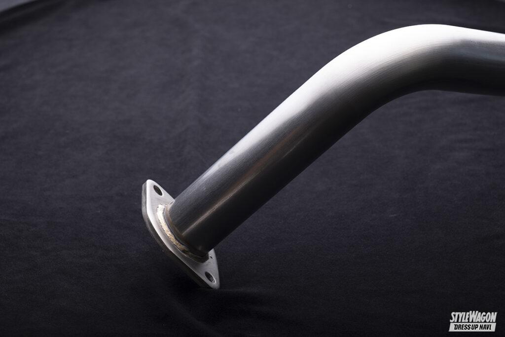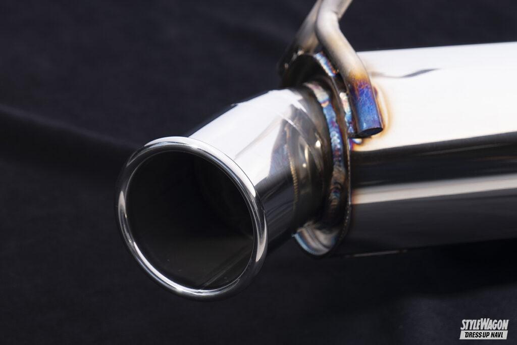 素材はオールステンレスで、メインパイプは60φ。テールエンドはレーシーな砲弾型のななめ出し100φだから迫力もたっぷりで、レーシングカー用と同じ接ぎ仕上げが採用されているから、一般的な曲げ加工仕上げとはひと味ちがった躍動感も堪能することが可能だ。