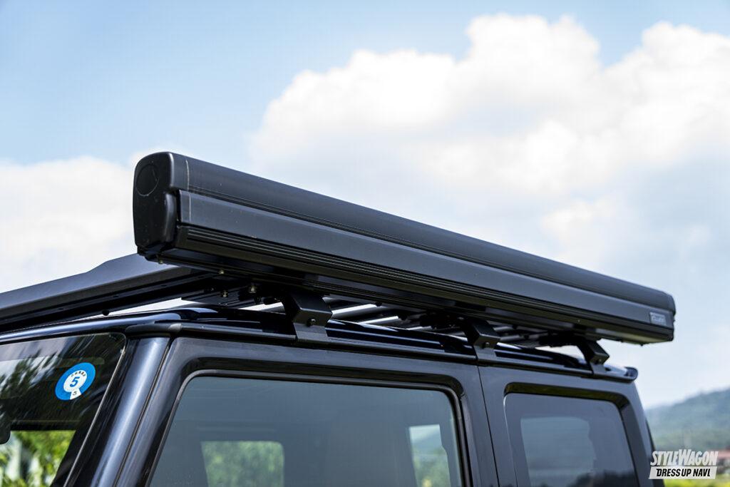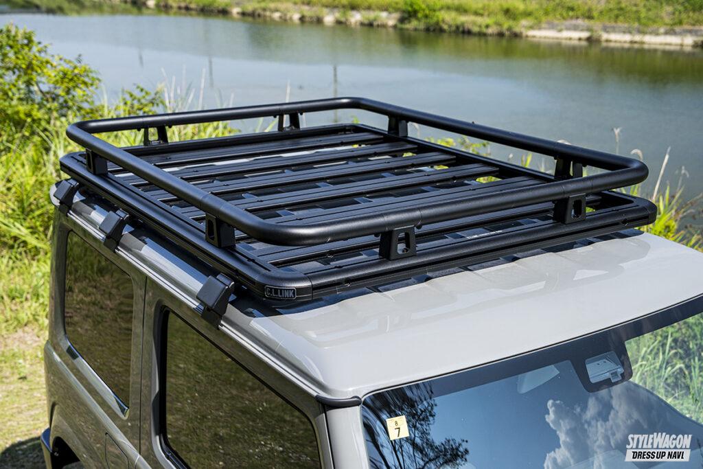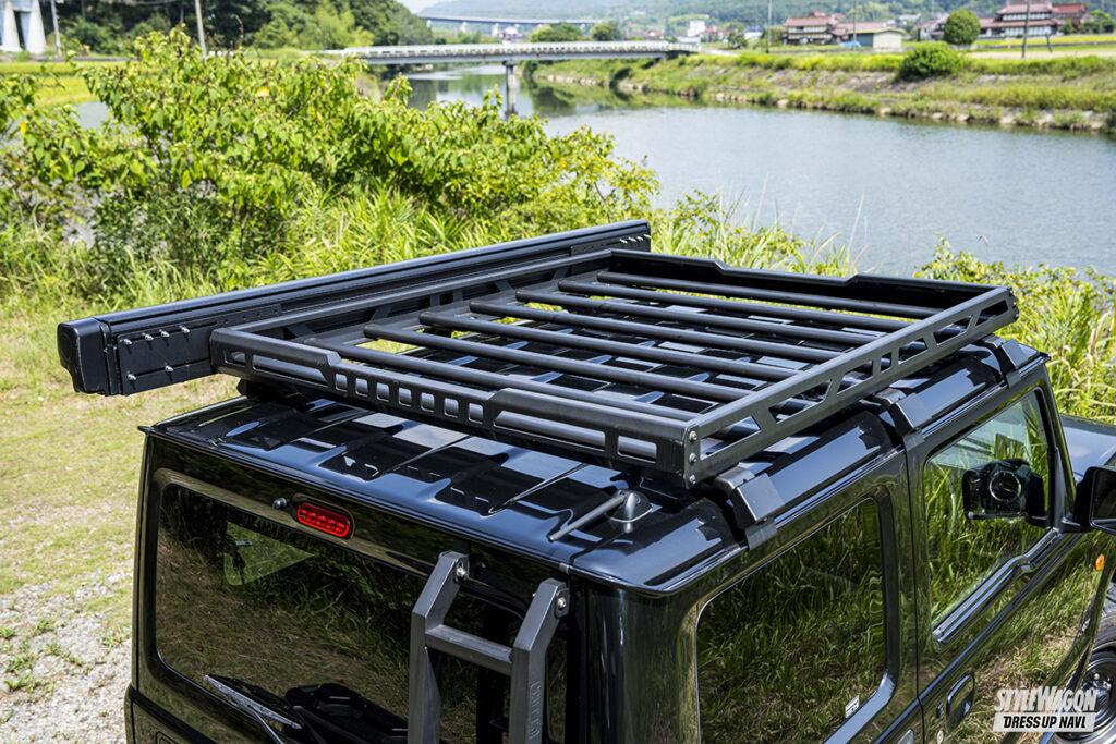 ボディとのクリアランスを最小限とし、JB64/JB74のフォルムに合わせたエッジを利かしたシャープで一体感のあるデザインが特徴。前面はトラックのエアディフレクタ—風のデザインを取り入れ、風切り音も抑えている。素材は軽量かつ耐久性に優れるアルミ製。耐荷重は100㎏を誇る。