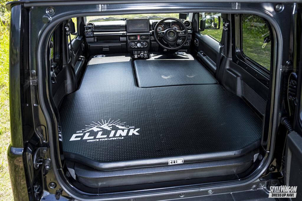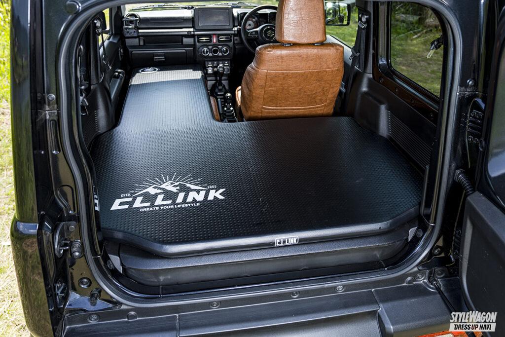 車中泊に必須といえるフラットエアベットも運転席部分をあえて別体構造化。これにより、ベッドを敷いたまま目的地に移動ができ、設営の手間も軽減。到着後すぐにキャンプ基地として使えるのは、ジムニー界で広がるソロキャン対応だ。すべてのパーツは機能だけでなく、実用性も考慮。痒いところに手が届くアイテム群はオーナーならば揃えたくなるはずだ。