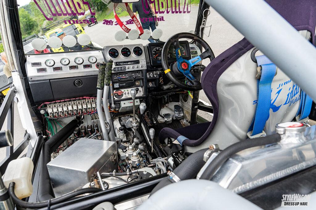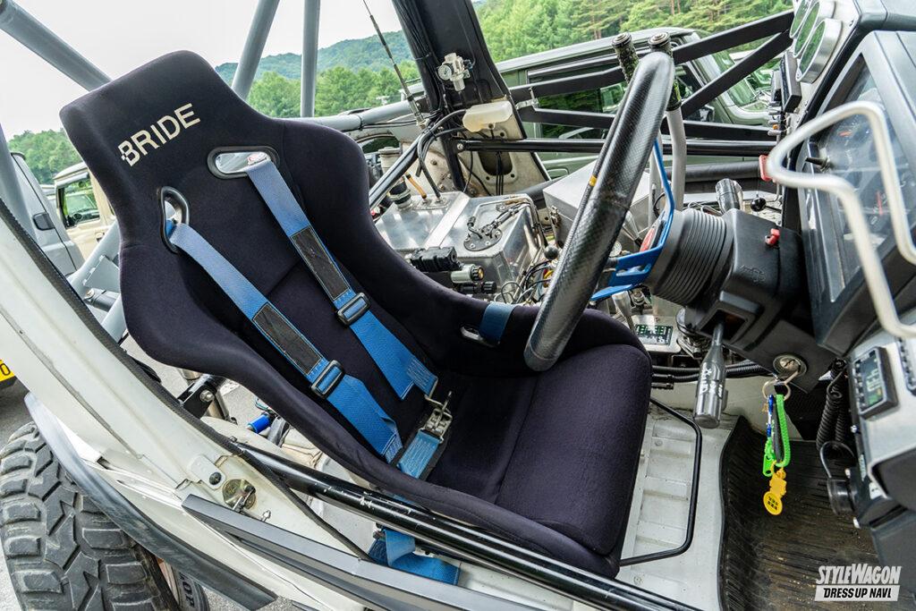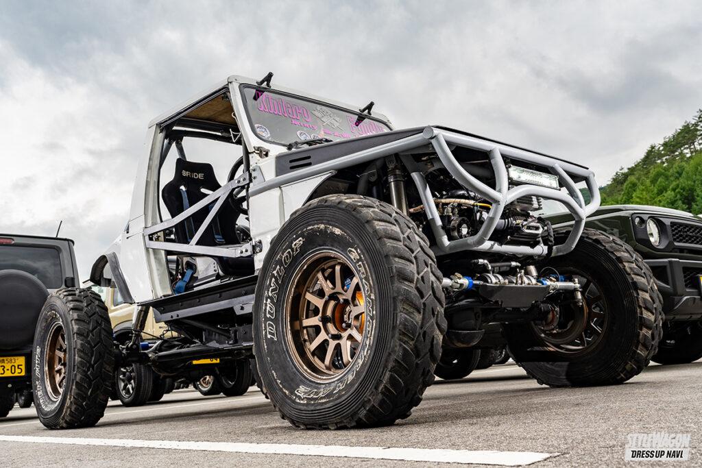 こちらはクローリング性能を突き詰めるためにJA110号さんが創り上げた化け物ジムニー。足まわりは4リンク、4WS、4エアサスで構成されており、ドライバーが任意に可変させることで、自由自在なディメンションでの走行を可能にしている。ちなみに純粋なジムニーとして残されているのは、パワーユニットとラダーフレーム、そしてコックピットを形成するボディの一部のみという完全なるコンペティションモデルだ。