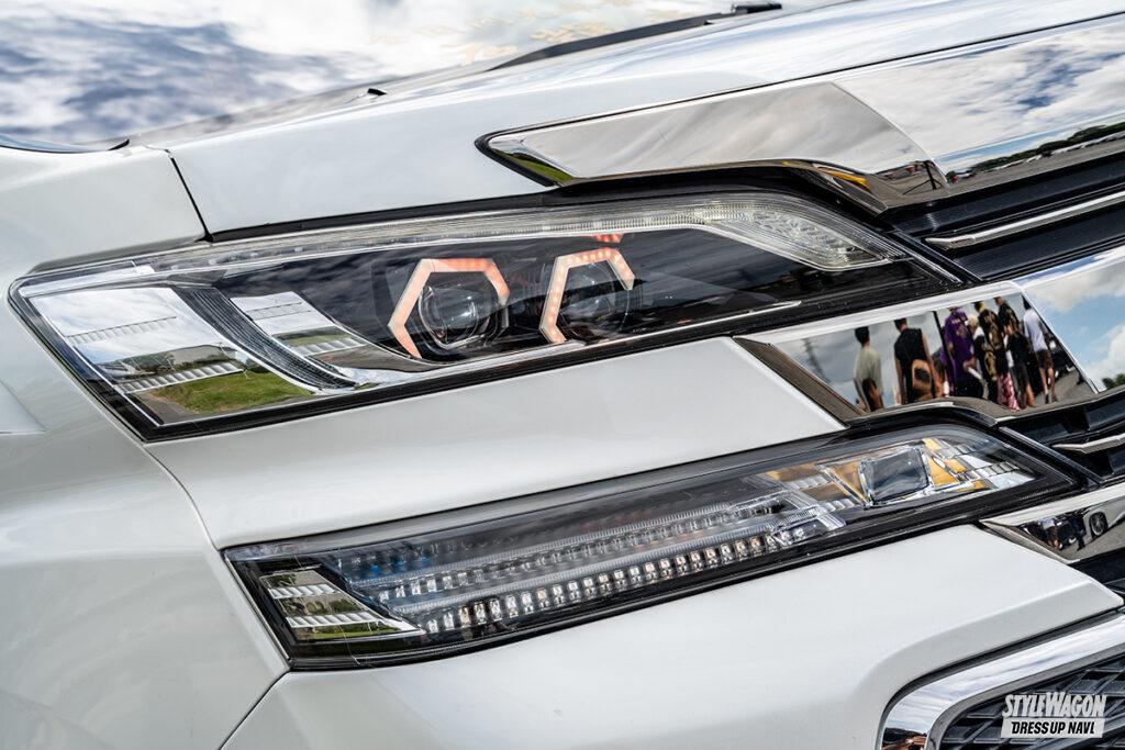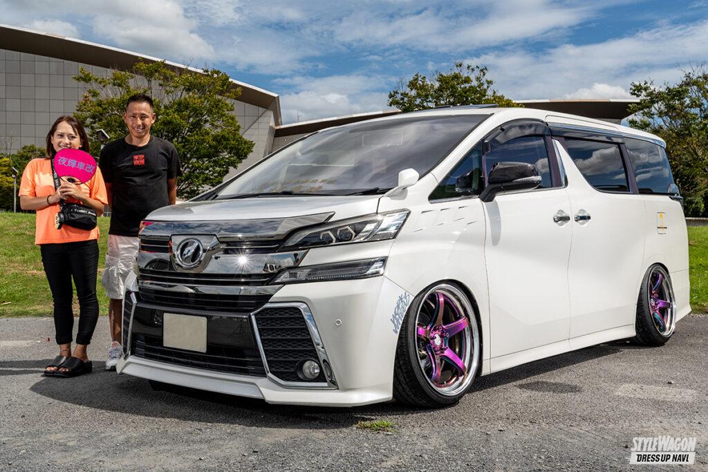 パープルにギラ光りしている足元のWORKエモーションが印象的な相川さんの30ヴェルは、現実味のある車高が物語るとおり生アシに拘ってのクルマ作りに注力。車高調による走って魅せられる極低フォルムを実現するため、スキッドレーシング製のアッパアームやキャンバーアダプターを介してディメンションを最適化。これに伴ってフロントフェンダーのダクト加工を含めてワンオフ加工を施し、しっかりとストロークするセッティングを獲得している。また、リアバンパーのカドッチョから顔を出すマフラーやヴィトン風に仕上げたサイドミラーも洒落てます!!