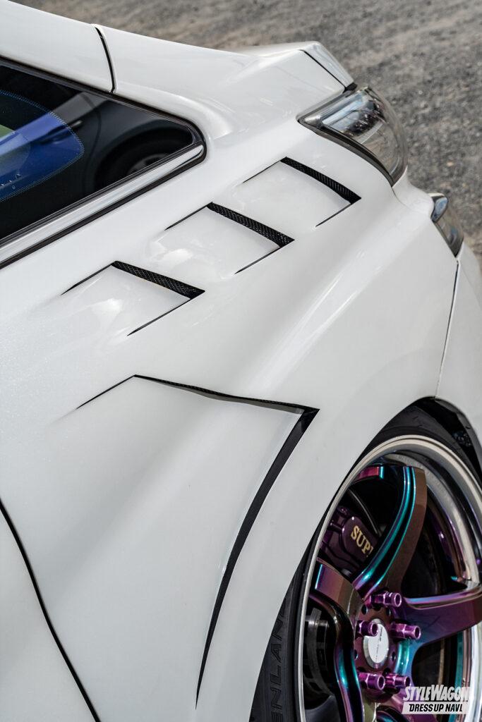 WHEEL●ワーク・ワークエモーションT5R(20×F9.5J-12、R10J-12) TIRE●グリンランダー(225/35) EXTERIOR●フェンダー/ヘッドライト/テール=ワンオフ TUNING●車高調=ブリッツ、マフラー=ワンオフ、アッパーアーム=スキッドレーシング 他