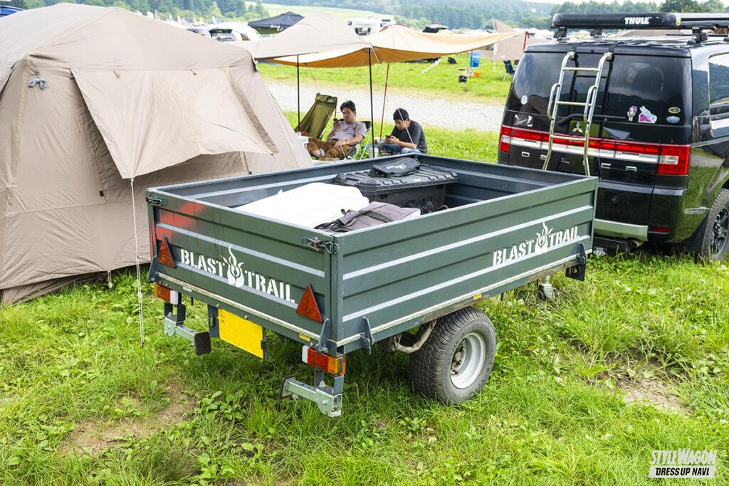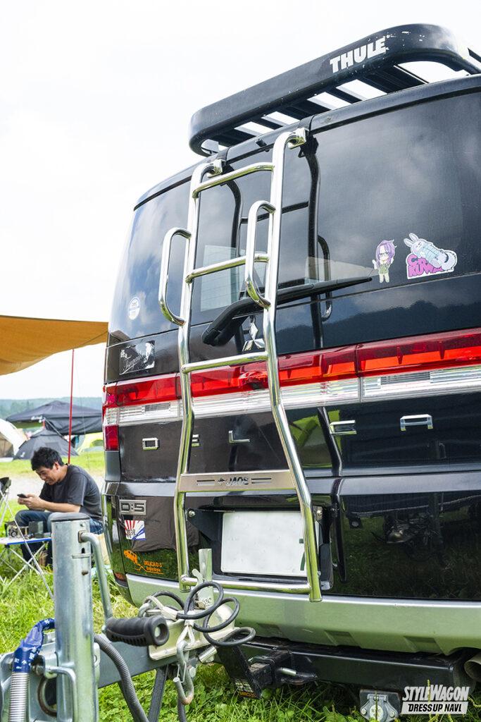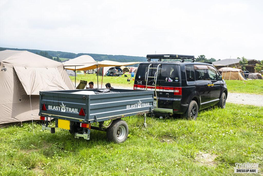 キャンプ仲間と一緒にスターキャンプに参加したゆうさん。愛車のデリカD:5はアクティブギアに憧れ、ドアミラーやバンパーガードなどをオレンジで自家塗装。バンパーガードのランプブラケットも自分で溶接した。ソロキャンならルーフラックで十分まかなえるが、荷物が多い場合はブラストトレイルのヒッチトレーラーも活用する。