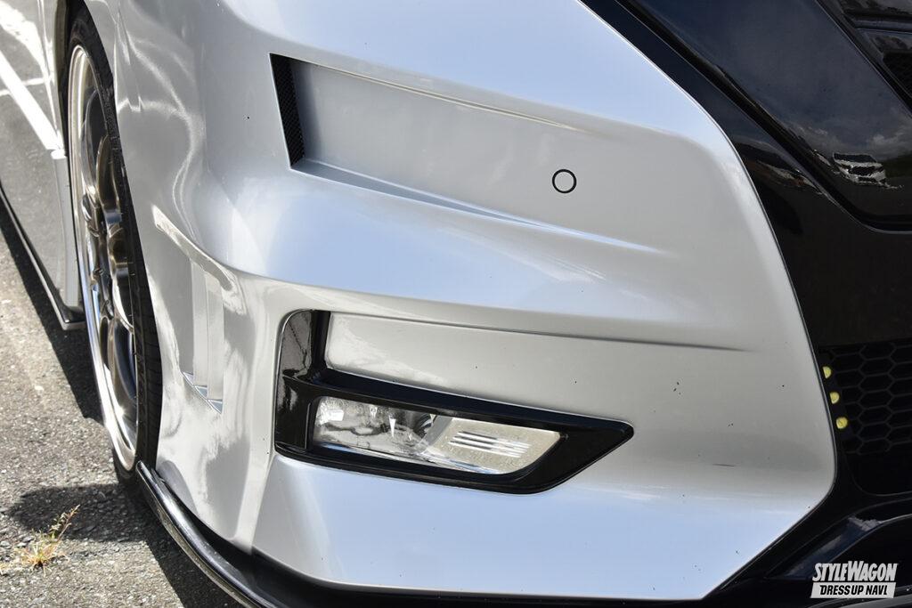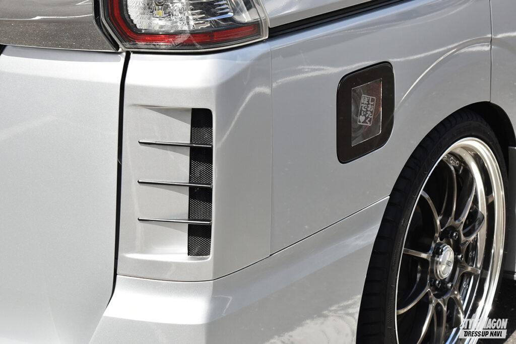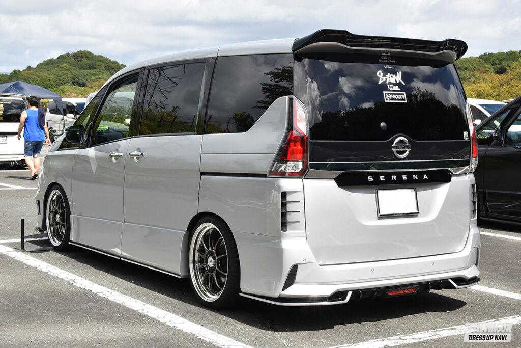 ハイウェイスター純正バンパーにシルクブレイズのリップを付けるだけでは終わらず、バンパーにダクト加工を施して走りのムードを高めたのがウリ。サイドはクラフテックの汎用フラップ、リアもシルクブレイズのスポイラーを装着してバランスの良いスタイリングをゲットした。ボンネットスポイラーは他のセレナユーザーにも人気のしおたくぼでぃでワンオフ製作。