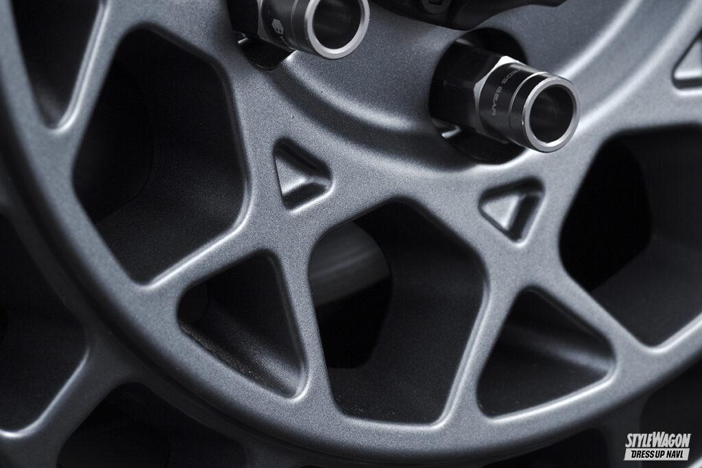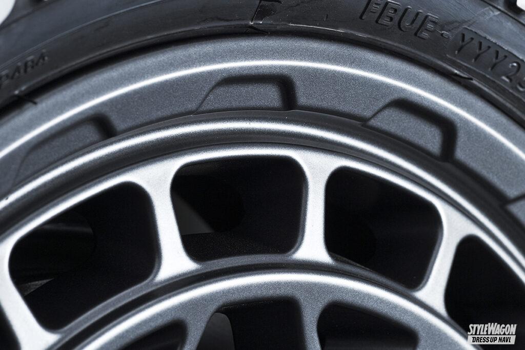 外周は同一デザインで、センター形状が異なるのがマッドヴァンスX3部作の特徴だが、このタイプMに採用されるセンターデザインは、キレ味もバツグンな9交点メッシュ。外周がスクエア窓となるため交点スポークとのギャップ感が強く、外と中との意匠が異なるのは本格的なデザートレース用ホイールのそれも連想させてくれる。とにかくギア感が強く、アグレッシブで躍動的なのが魅力だ。