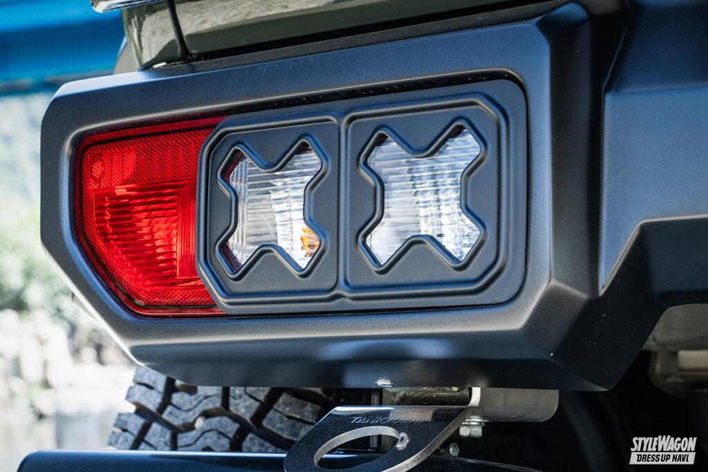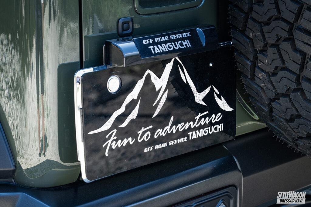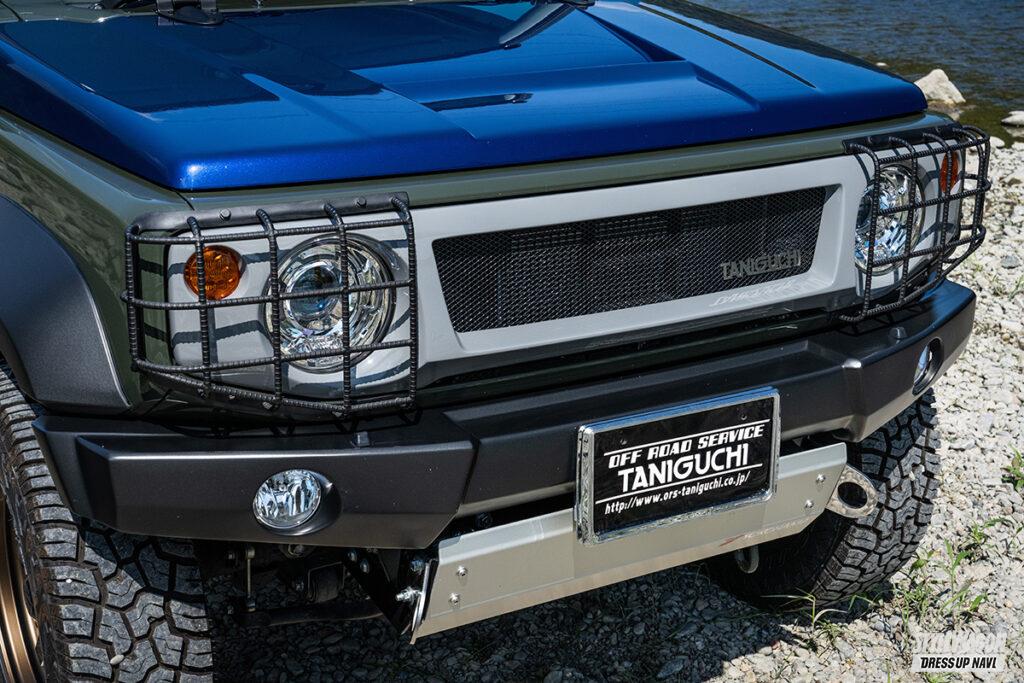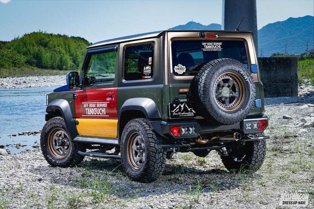 オフロードサービスタニグチのもう一台はJB74。コンセプトは大人ジムニー。このコンセプトを聞いた上で、カラーリングを見ると「?」と思う人も多いと思う。原色系に塗られたボディは、一見するとかなり奇抜にも見える。しかし、このカラーリングは、クレイジーカラーと呼ばれる配色で、アウトドアガイドなどが好んで着る服装を模しており、アウトドアでの視認性を高める配色なのだ。